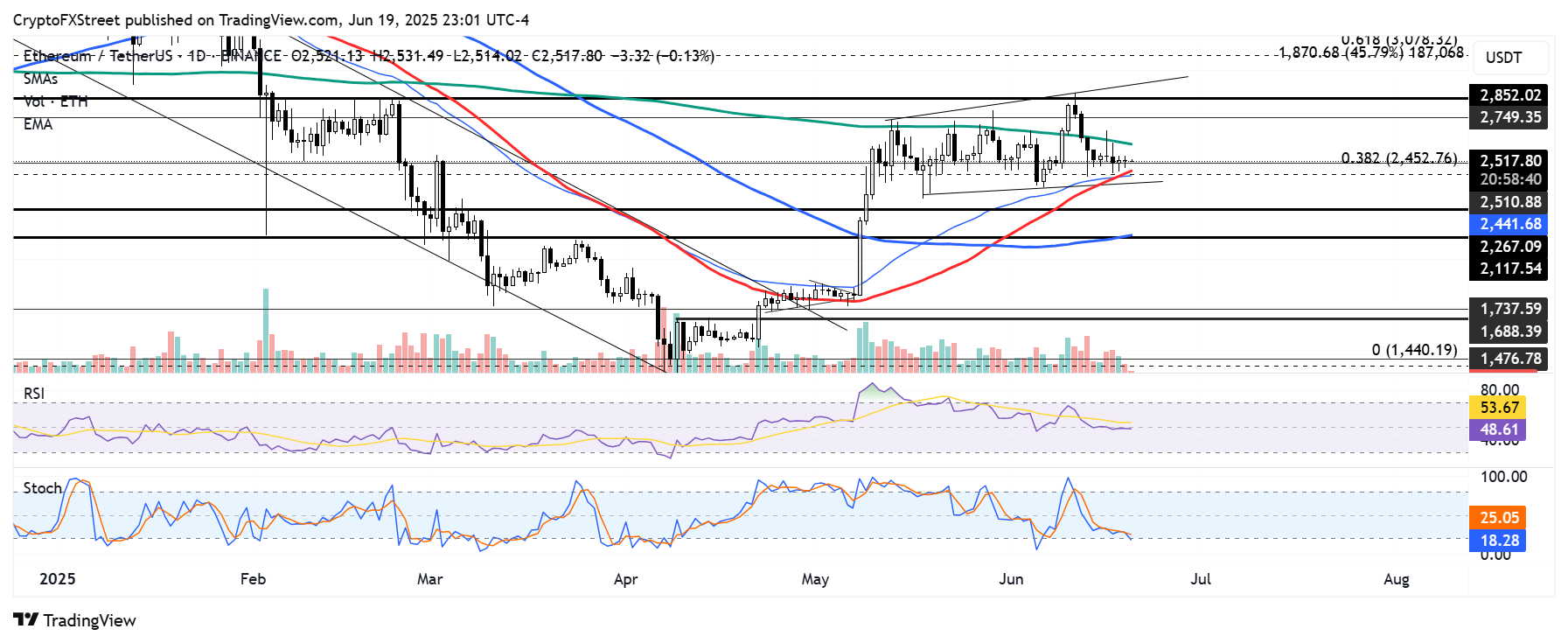 قال محلل FXStreet مايكل إيبيكوتان إن إيثريوم (ETH) تواصل الحفاظ على مستوى الدعم عند 2450 دولارًا، وهو مستوى تصحيح فيبوناتشي بنسبة 38.2%، نظرًا لصعوبة تجاوز المتوسط المتحرك البسيط لمدة 200 يوم (SMA). إن تقاطع المتوسط المتحرك لمدة 50 يومًا ومتوسط التحرك الأسي (EMA) فوق الحد السفلي للقناة الرئيسية يعزز هذا المستوى.