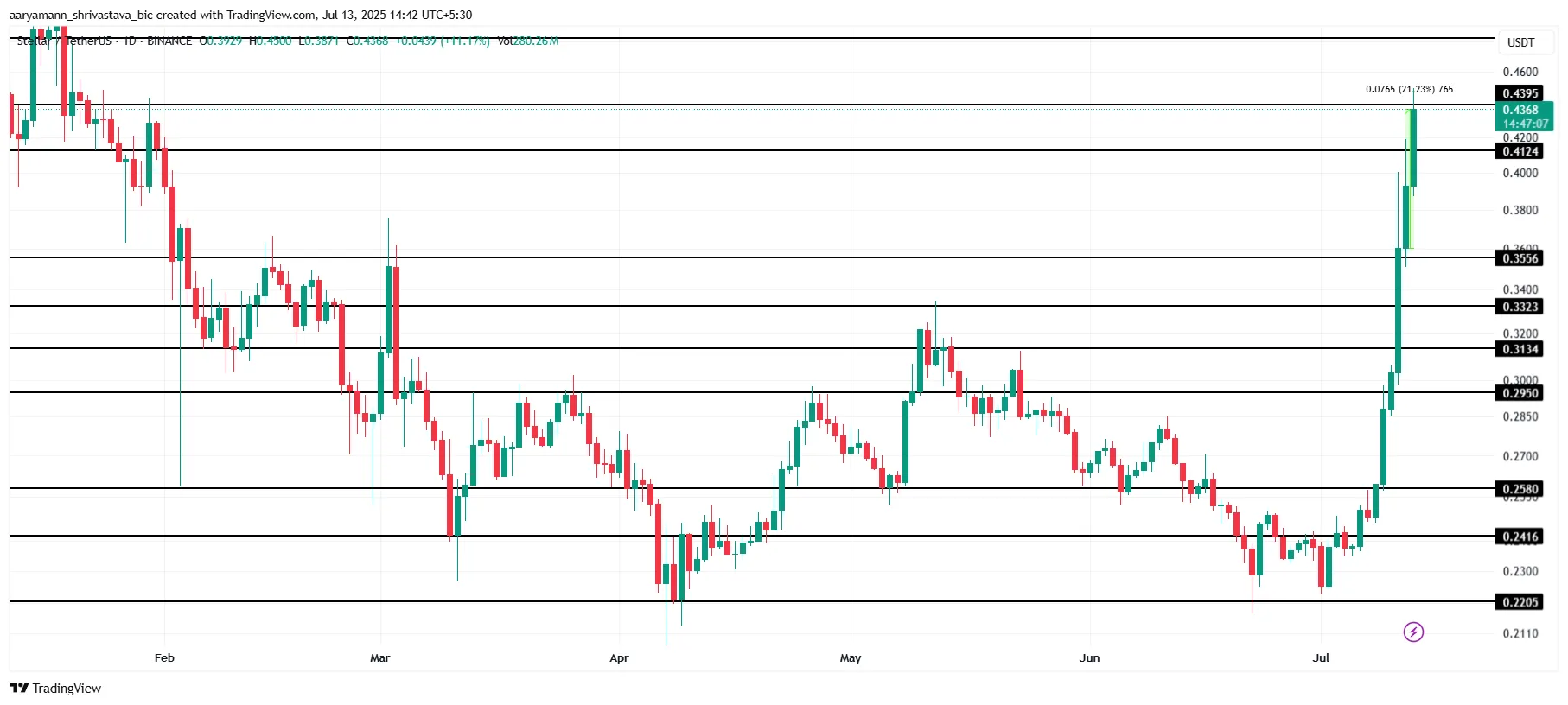 XLM حركة السعر في الساعات ال 24 الماضية قد ارتفعت بنسبة 13%، وكان سعر التداول حوالي 0.442 دولار. هذا altcoin قد ارتفع بنسبة 68% هذا الشهر، مما يدل على تزايد اهتمام المستثمرين.