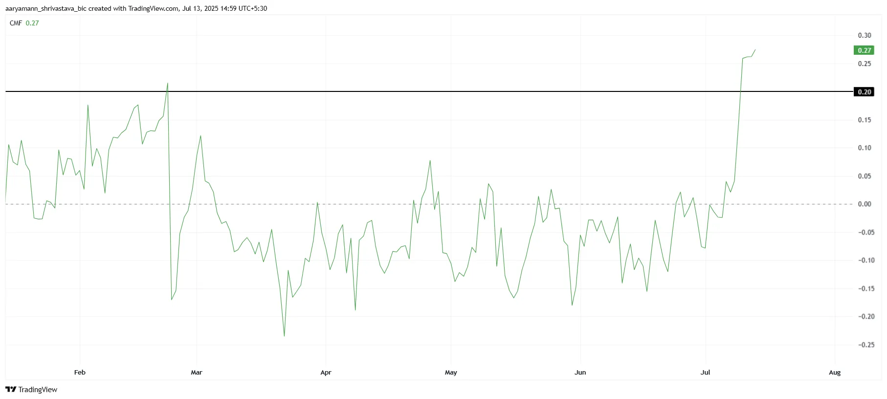 ومع ذلك، تاريخياً، عندما يتجاوز CMF 20، يكون ذلك إشارة تحذير لحالة الشراء المفرط، والتي قد تؤدي إلى تعديل السعر.