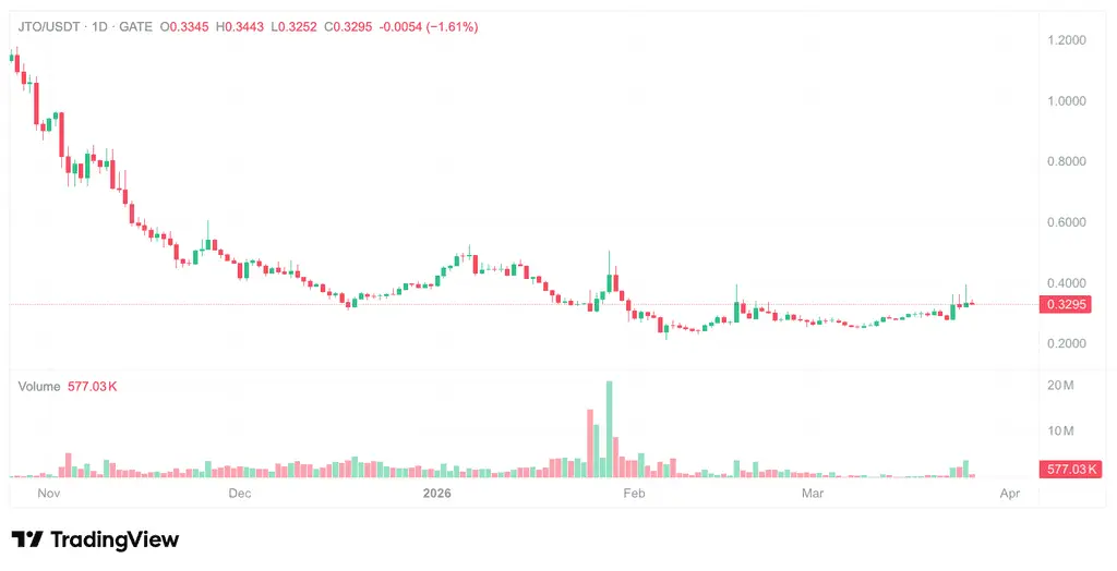 في نظام بيئة سولانا، كانت Jito (JTO) تعتبر مشروعًا أساسيًا بفضل حلولها المبتكرة لـ MEV (القيمة القصوى التي يمكن استخراجها) ومنتجات الرهن السائلة، إلا أن تقلبات السوق الأخيرة أعادت تسليط الضوء عليها. حتى 26 مارس 2026، وفقًا لبيانات Gate، بلغ سعر Jito (JTO) 0.3317 دولار، متراجعًا بنسبة 11.81% خلال الـ 24 ساعة الماضية، بينما سجل خلال الـ 30 يومًا ارتفاعًا بنسبة 18.19%، مما يعكس تقلبات حادة على المدى القصير. يهدف هذا التحليل إلى فصل الحقائق عن الآراء والتوقعات، لتقديم تقييم موضوعي للوضع المعقد الذي تواجهه Jito.