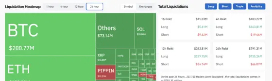 Según los datos del mercado, el volumen de liquidación en las últimas 24 horas alcanzó los 791 millones de dólares, un aumento de aproximadamente el 440% en comparación con el día anterior. Por tipo de moneda, el volumen de liquidación de Bitcoin fue de (2.01 millones de dólares), ligeramente superior al volumen de liquidación de Ethereum de (1.59 millones de dólares). La proporción de posiciones largas en el volumen de liquidación de Bitcoin y Ethereum fue de aproximadamente el 94% y el 88%, respectivamente. El volumen total de transacciones de activos digitales en el mercado creció aproximadamente un 70%. Los contratos abiertos (OI) disminuyeron un 4.67%.