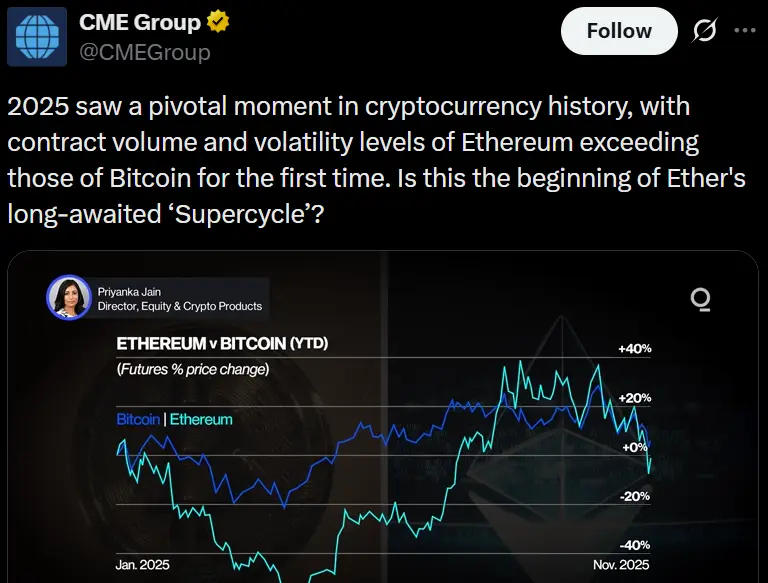 CME reaviva el debate sobre el 'super-ciclo' de ETH mientras el volumen de futuros de Ether supera al de Bitcoin
