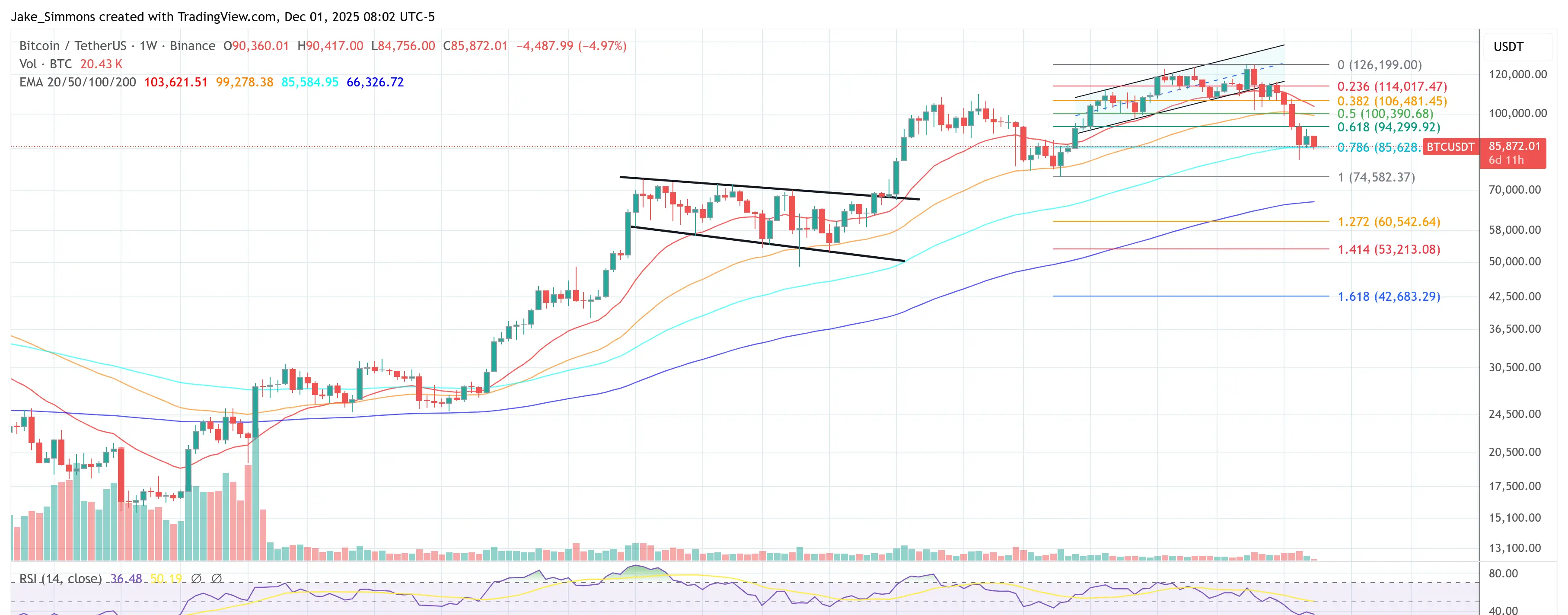 Reitera un marco que compartió por primera vez cuando Bitcoin se cotizaba a $109,000: “Compartí mi opinión @ $109K que BTC solo comienza a ser interesante < $75K, y una revisión de la SMA de 200 semanas es siempre posible (~$56K actualmente, tenderá a subir ), con todos esos números aún representando un oso tranquilo.” Para Burniske, un movimiento a esa banda – e incluso un toque de la media móvil simple de 200 semanas – no significaría un colapso estructural, sino un reinicio del mercado bajista más ordenado y “tranquilo”. Agrega una advertencia contundente: “¿Podemos bajar más? Claro. Paga tus impuestos y veamos qué trae 2026.”
