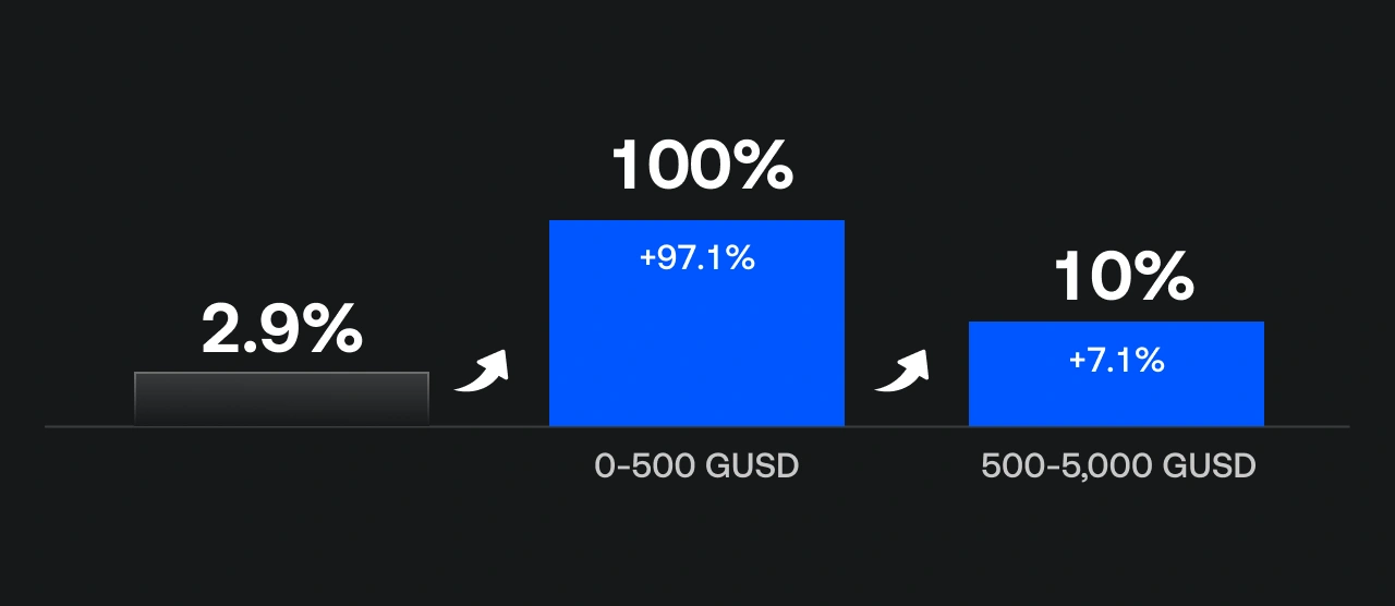 - Seuls les nouveaux utilisateurs n’ayant jamais détenu de positions Spot en GUSD ni participé à la distribution d’intérêts du minting GUSD ou à des programmes de Staking avant le 28 avril 2026 à 00h00 (UTC) sont éligibles à l’APR bonus. Les utilisateurs voyant l’information relative au bonus lors de leur connexion sont automatiquement qualifiés.