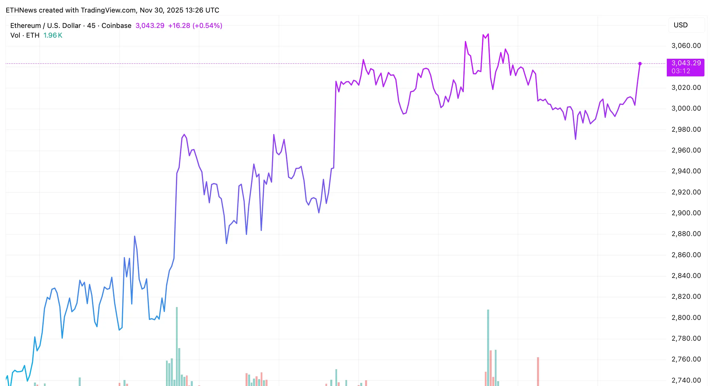 Chart 45 menit terbaru menunjukkan ETH diperdagangkan di dekat $3,043, mendapatkan momentum yang stabil setelah beberapa hari volatilitas yang terkompresi.