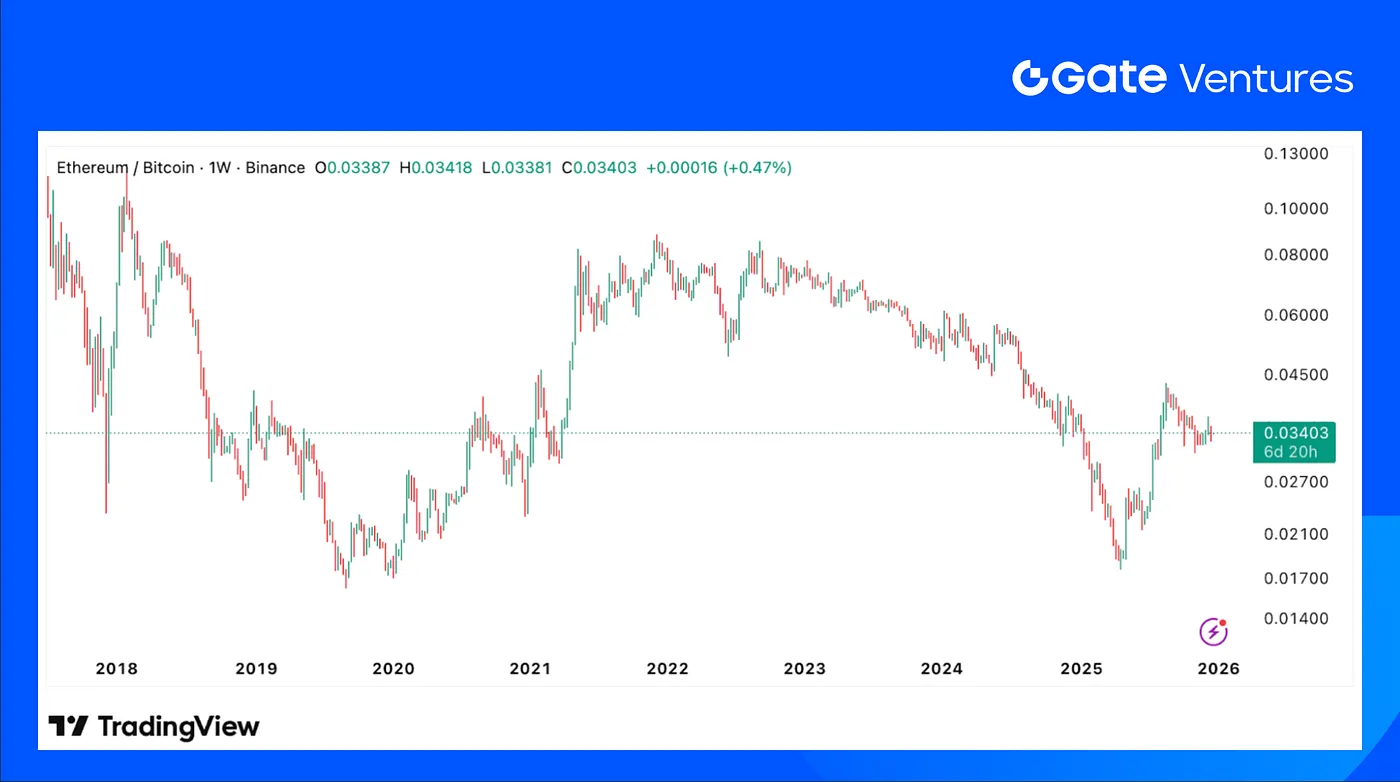 BTCは過去1週間で0.55%上昇しましたが、ETHは1.97%の下落でパフォーマンスが劣りました。ETH/BTC比率は2.5%低下し0.034となり、ETHの相対的な弱さが続いていることを示しています。(5)