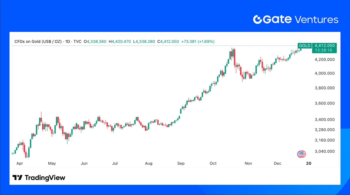 金は12月22日に初めて1オンスあたり4,400ドルを突破し、スポット取引は新しい日中記録を更新した後、約4,412ドルで推移しています。要因としては、利下げ期待、ドル安、地政学的・貿易緊張のヘッジ、そして中央銀行の需要の継続が挙げられます。(4)