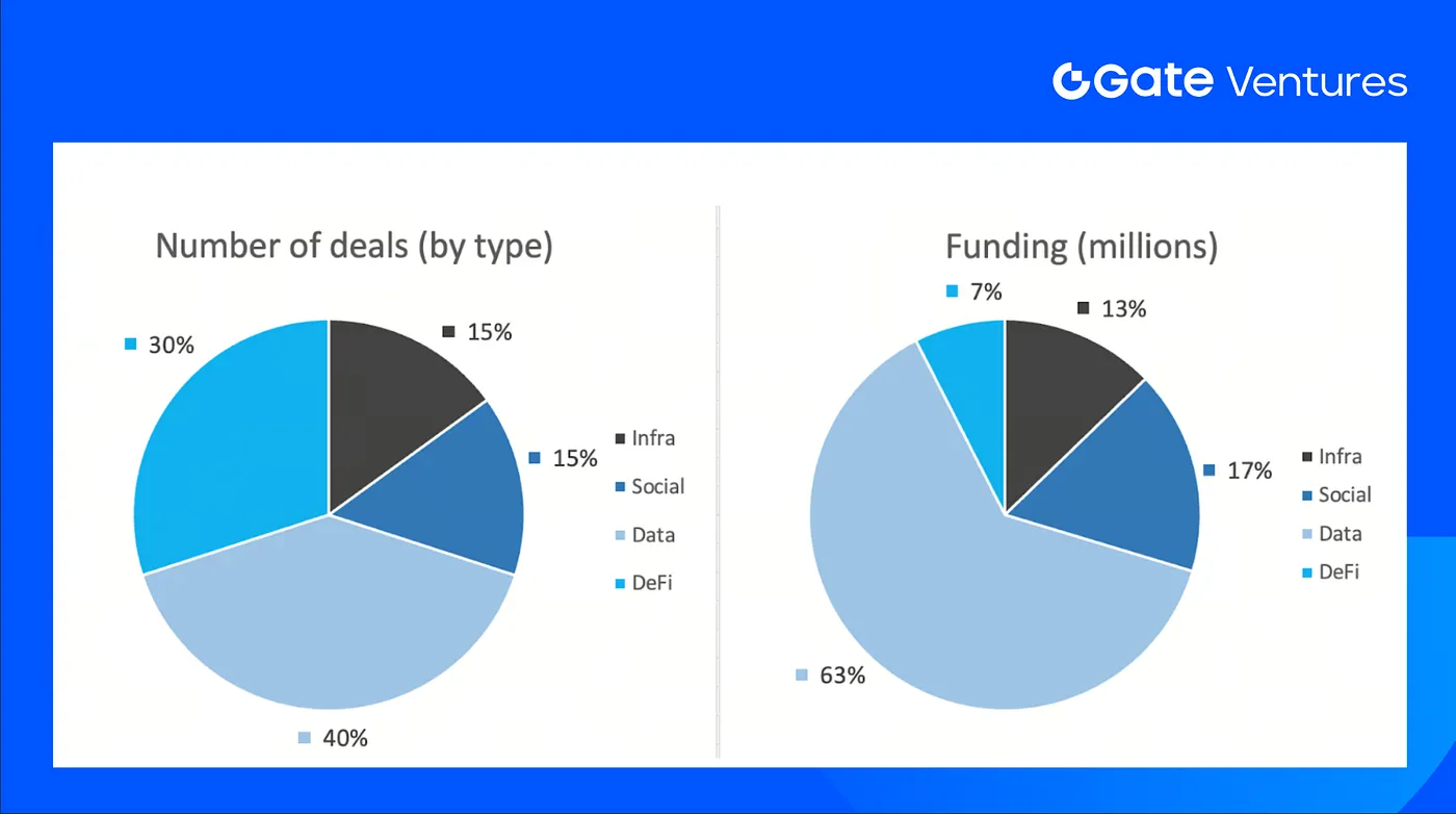 先週、20件の取引が成立し、データが8件、つまり全体の40%を占めました。一方、インフラは3件(15%)、ソーシャルは3件(15%)、DeFiは6件(30%)でした。