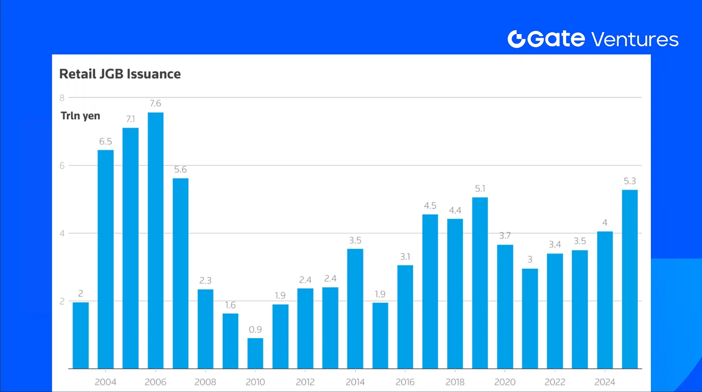 日本は、約7兆ドルと推定される大規模な家計貯蓄を動員し、政府債券のより安定した需要源として活用することをますます目指しています。現在、家計は発行済みの日本政府債務のごく一部のみを保有していますが、最近の発行データは行動の重要な変化を示しています。小売のJGB発行は、2010年の1兆円未満から2024年には約5.3兆円にまで着実に増加しており、10年以上ぶりの最高年間水準を記録しています。この回復は、プラスの利回りの復活を反映しており、より高い金利が家計のポートフォリオ配分決定により効果的に影響を与えていることを示唆しています。(1)