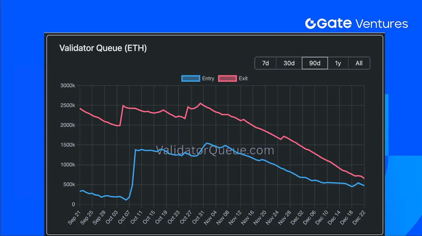 したがって、ETHバリデーターの退出と入場のギャップは約18万ETHに縮小されており、ステーキングされたETHの純変化が小さく、大規模なバリデーターが退出する選択をすることが少なくなったことを示しています。 (7)