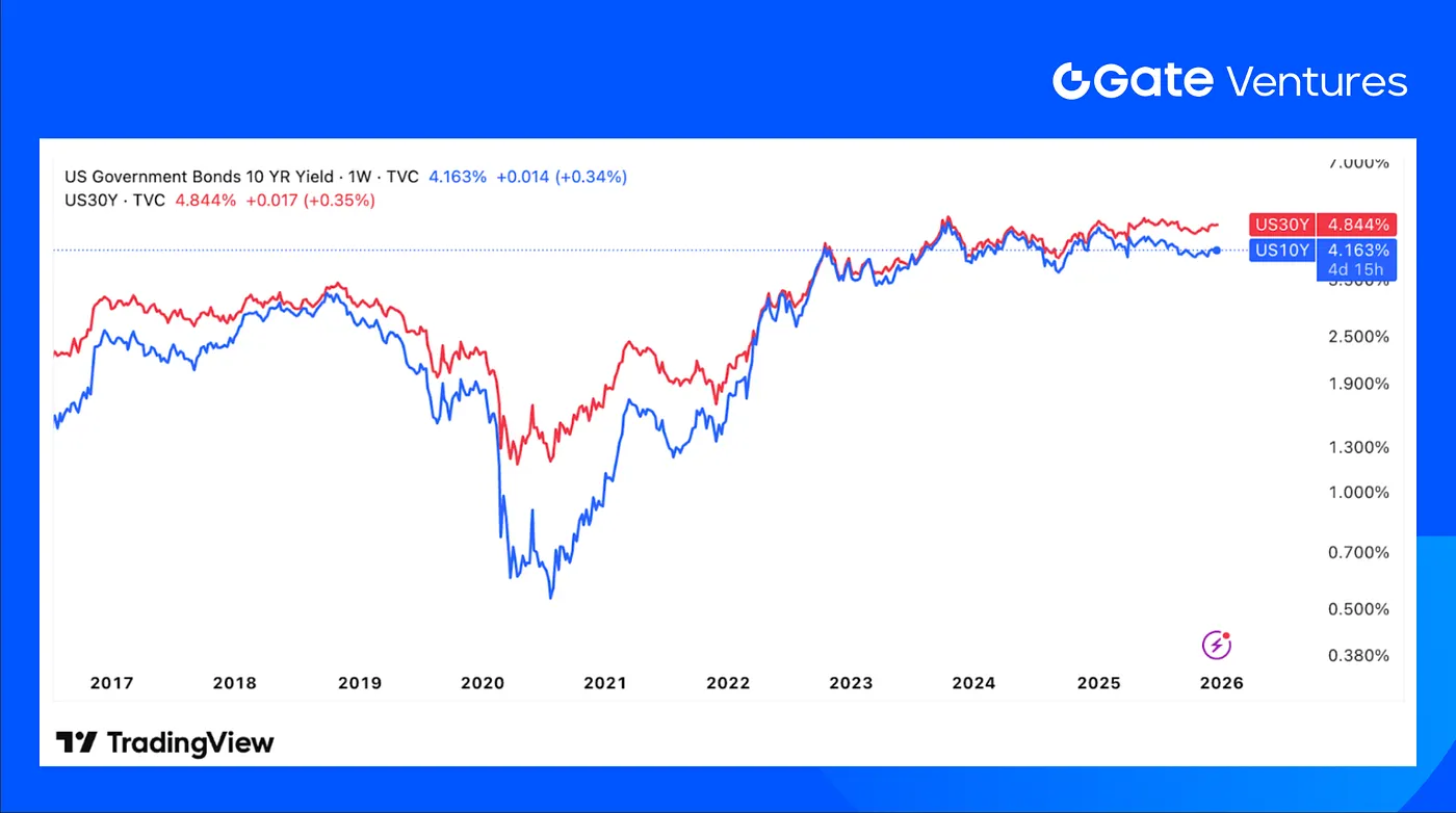 2025年12月22日時点で、10年物国債の利回りは4.16%で終了し、30年物国債は4.84%で終わりました。政策金利の引き下げ後も長期の利回りは高止まりしており、これは(i) インフレの不確実性、(ii) 期間プレミアム/供給懸念、(iii) クロスマーケットの金利の再評価を表しています。