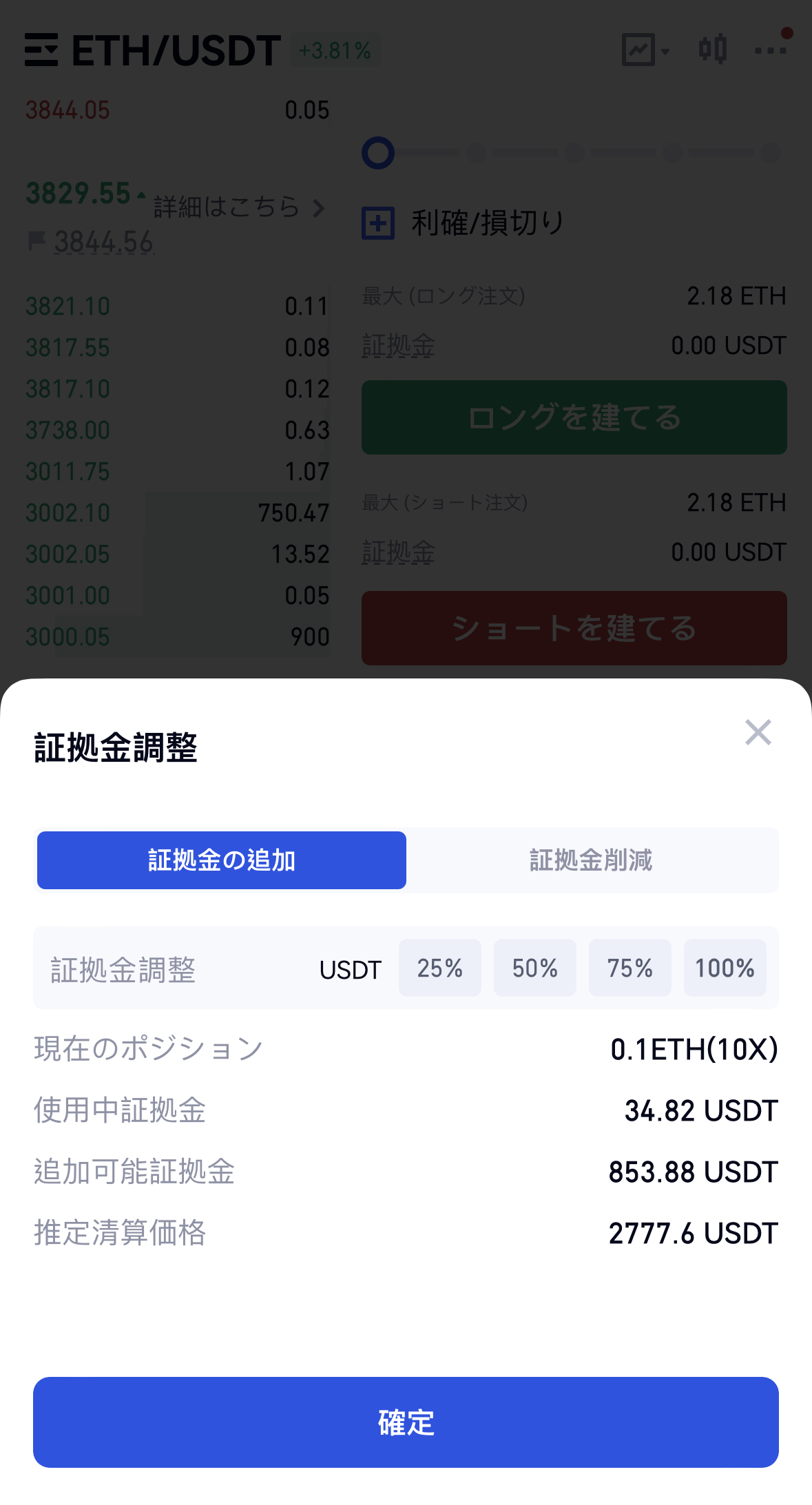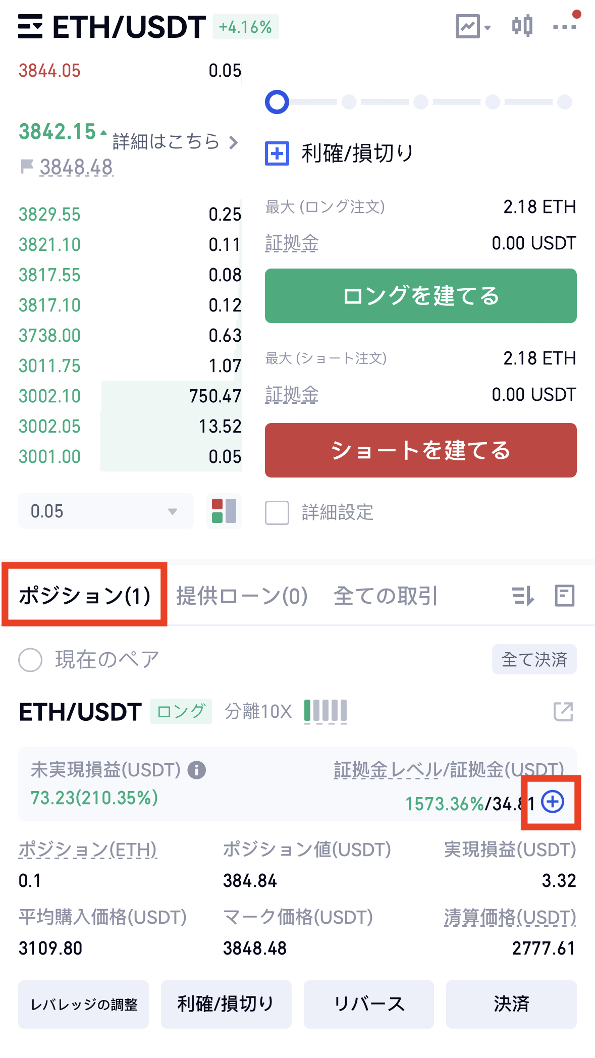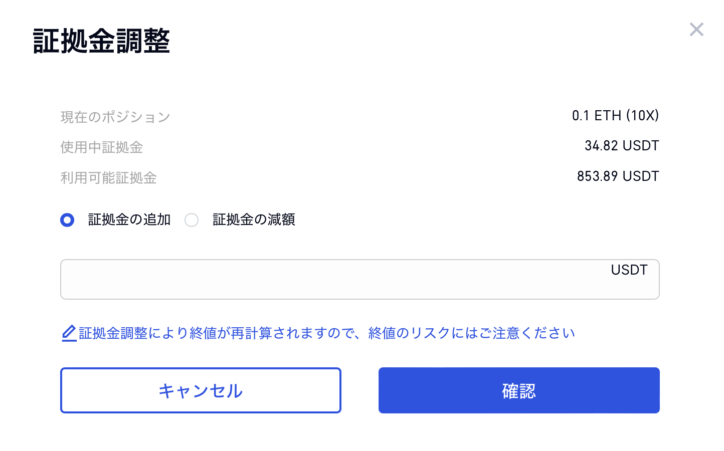 ユーザーは、ポジション ページの証拠金の値をクリックして、調整する証拠金の増減額を入力できます。