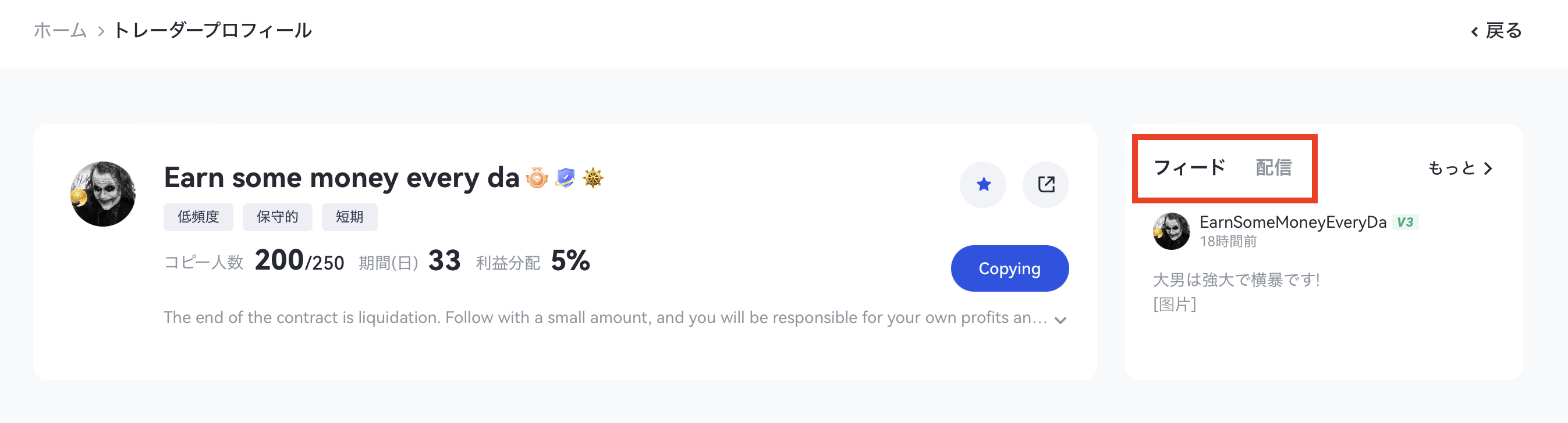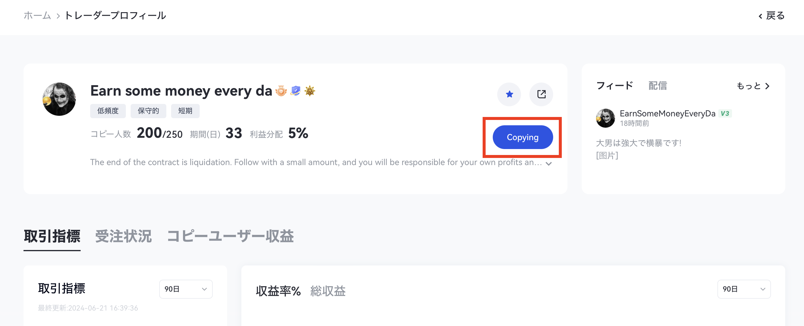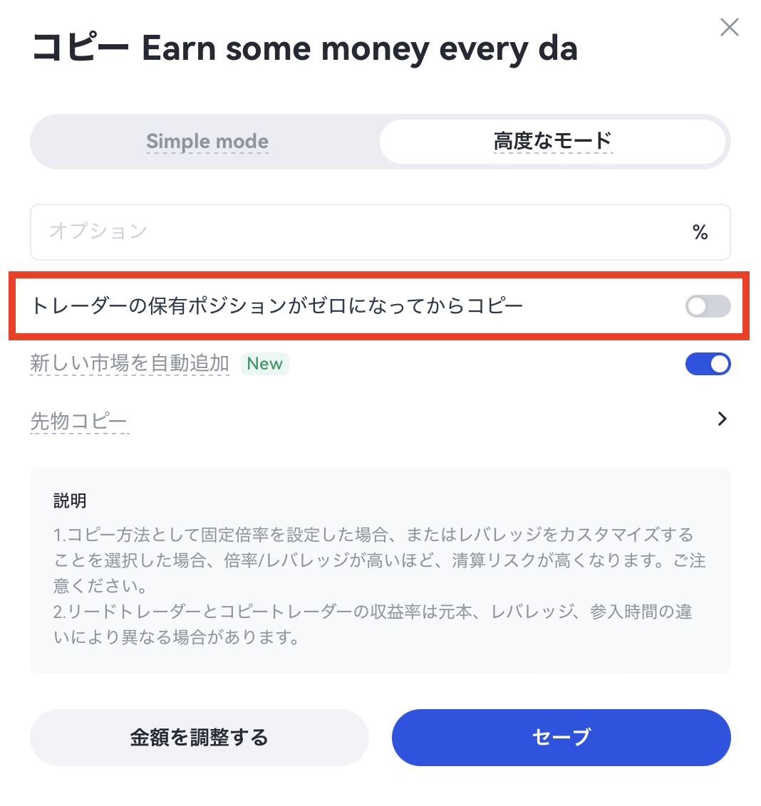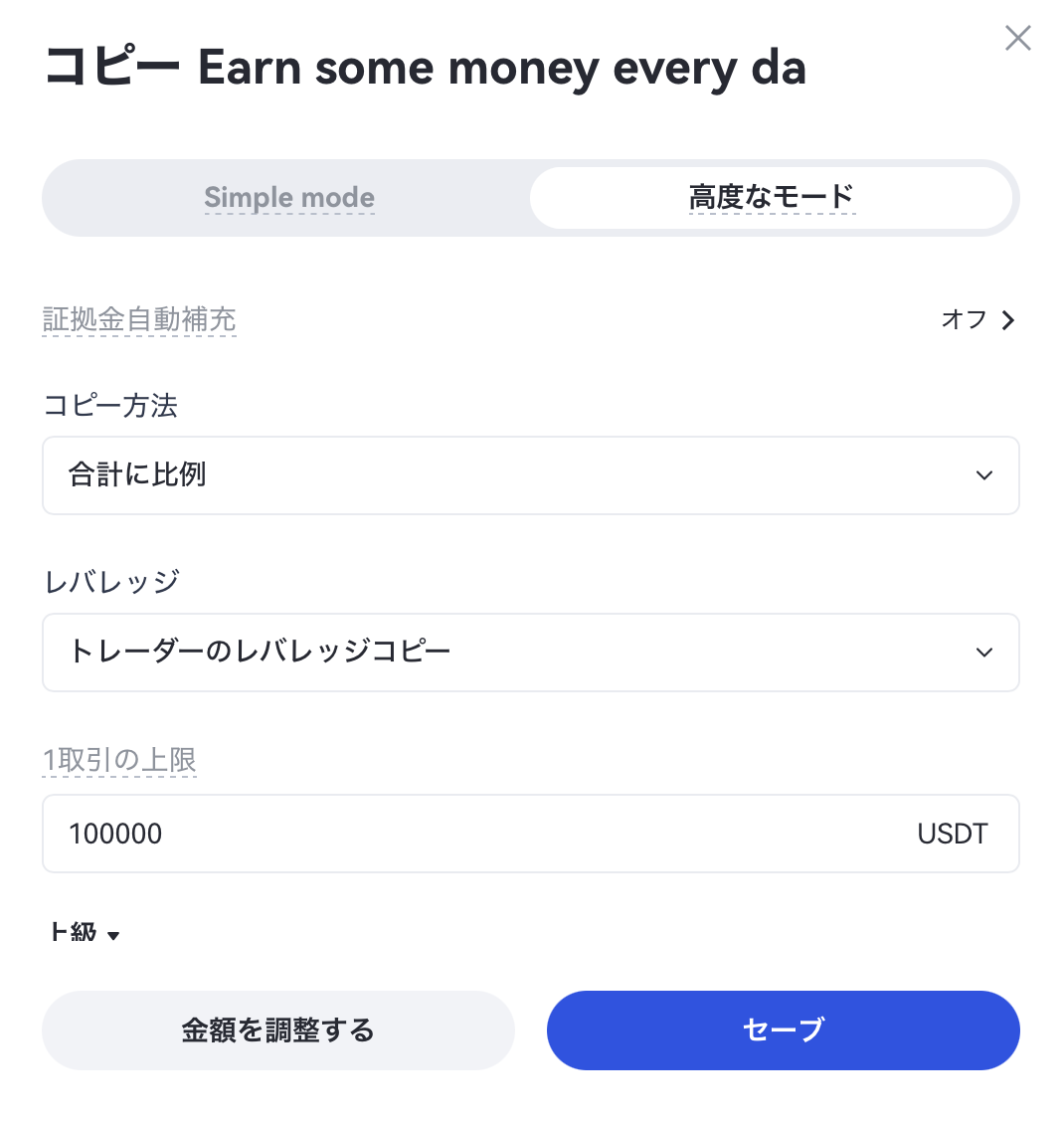 後のユーザーのパラメーター調整ニーズを満たすために、現在のバージョンではコピーユーザーがコピーパラメーターを調整することをサポートしており、ユーザーはコピー操作後に自分のコピーパラメーターを調整することもできます。(レバレッジ調整、追加の書類資金、など)