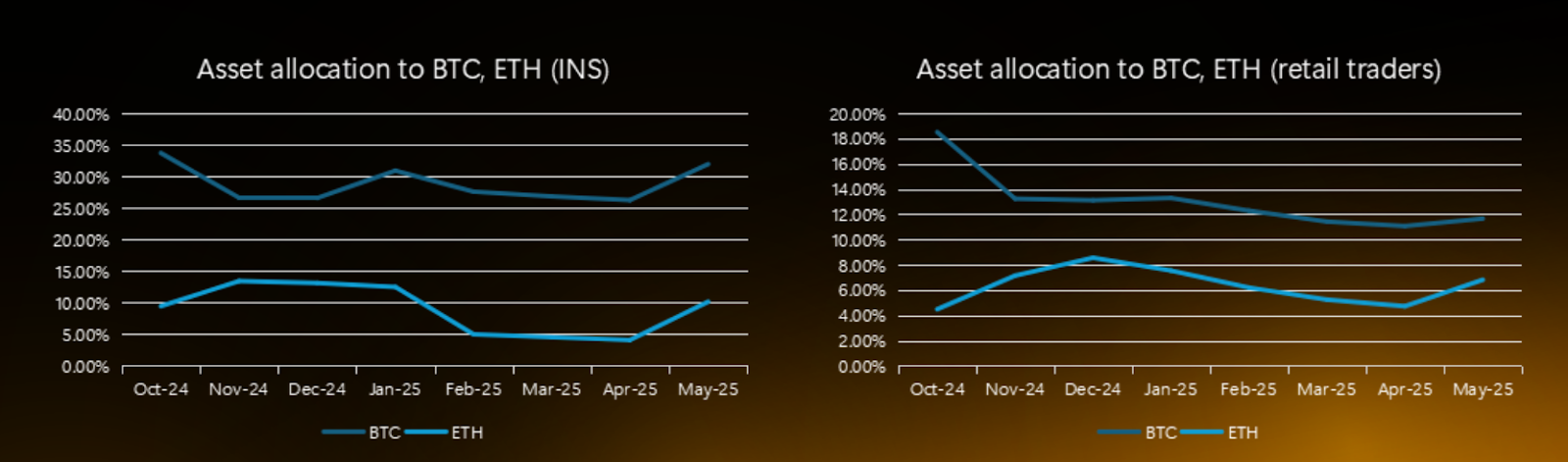 報告によると、これは1ドルのEtherの価値ごとに、投資家は現在、自らの投資ポートフォリオにおいて約4ドルのビットコインの価値を保持しています。Etherのホールド率は減少していますが、2025年4月末にはわずか0.15%に過ぎませんでしたが、現在では0.27%に回復しています。