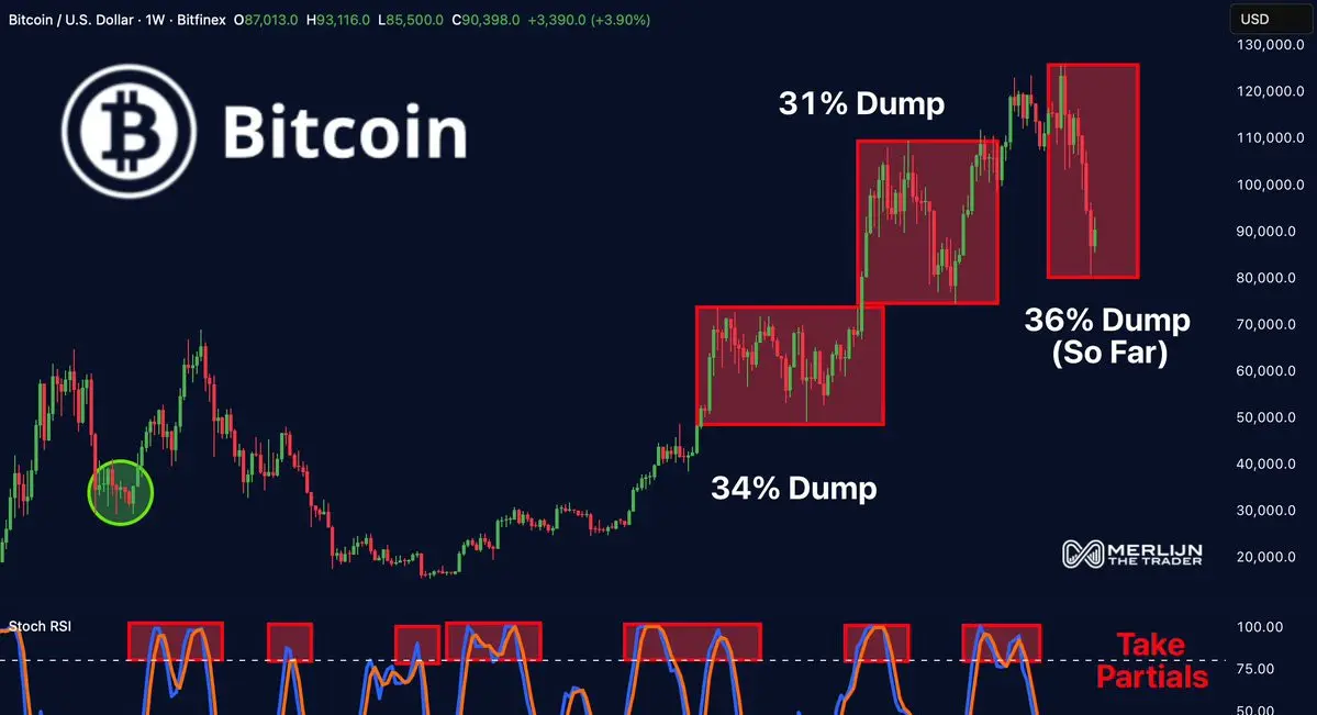 ソース: ETHNews原題: ビットコインは30%以上の大暴落を乗り越えた: 歴史が示すこの苦痛がチャンスである理由オリジナルリンク: https://www.ethnews.com/bitcoin-just-survived-over-30-crash-why-history-says-this-pain-is-opportunity/ビットコイン保有者は、サイクルの中で最も厳しい引き下げを経験しました。最近の高値から36%の下落の後、多くの短期トレーダーが降伏し、取引所では強制的な売却の波が見られ、センチメントは数か月で最低のポイントに崩壊しました。しかし、市場アナリストのメルライン・ザ・トレーダーによれば、この大混乱を乗り越えた人々は、彼が「レジェンド・テリトリー」と呼ぶものに入っているかもしれません。## 三つの主要なダンプ、一つの繰り返されるパターンこのチャートは重要なことを示しています:この36%の崩壊は異常ではありません。ビットコインは現在のサイクルで、2024年に34%の修正、2025年初頭に31%の下落など、同様の崩壊をすでに経験しています。それぞれの激しい売りはモメンタムをリセットし、市場から弱い手を排除し、最終的には次の主要な上昇の基盤を築きました。この最新の修正はさらに深く戻っていますが、ビットコインの高値更新と厳しい調整の長期的なリズムに完璧に合っています。歴史的に見て、これらの構造はサイクルのスプリングボードとして機能してきました。過剰なレバレッジをクリアし、積極的な反発の舞台を整える急激なリセットです。## Stoch RSI がサイクルボトムを示すチャートの下部にあるストキャスティックRSI指標は独自の物語を語っています。ストキャスティックRSIが緑の蓄積ゾーンに崩れ込むたびに、ビットコインはマクロボトムを形成していました。それは2022年を通じて起こりました。2024年の中周期リセットの際にも起こりました。2025年初頭の31%の売却後にも再び起こりました。そして今、この36%の大幅下落の後、ストキャスティックRSIは再び底を打っています。これが重要なのは、インジケーターが単に売られ過ぎの状態を示しているのではなく、主要なトレンドの反転前に見られるのと同じ構造を点滅させているからです。チャートによると、このゾーンは歴史的に、規律あるDCA(ドルコスト平均法)の買い手が静かに蓄積を行い、感情的なトレーダーが最悪のタイミングで退出する期間を示しています。## 恐れも底を打つテクニカルを超えて、センチメントはクラシックな後期段階のキャピテュレーション行動を示しています。資金調達率はマイナスに転じました。永続的スワップのオープンインタレストは崩壊しました。小売活動は干上がりました。ビットコインの検索トレンドは下降しました。ロングタームホルダーがポジションを追加している一方で、ショートタームホルダーはパニック売りをしています。この感情的なリセットは、マーリンが「歴史は忍耐強い者を報いる」と言う理由の一部です。市場の底は興奮の中で形成されるのではなく、信頼が消え、確信だけが残るときに形成されます。## なぜ痛みが次の大きなセットアップを生み出したのかビットコインの最後の2回の大きなシャケアウトは、爆発的なトレンドの継続に続きました。この構造、ダンプ、横ばいの安定化、Stoch RSIのリセットは、以前の回復脚の始まりと完全に一致します。チャートはこの関係を強調しています:赤いボックスはワイプアウトを示し、緑のボックスは蓄積ゾーンを示し、各遷移は最終的にブレイクアウトにつながりました。今日、同じシナリオが再び展開されています。そして、長期投資家にとって、これはサイクルが最も大きな機会を提供する瞬間です。多くの人々は恐怖から退出しました。より少数のグループは、歴史的な勝者が常にそうしてきたように、勢いが戻る前にポジショニングを行う準備をしています。## サイクルのメッセージビットコインは感情に頼ったすべての人を罰してきました。それは構造に頼ったすべての人を報いることができました。この36%の下落は異常ではありません。これは全体のサイクルを定義しているパターンの一部です。そして、歴史が続くのであれば、壊滅的な状況を乗り越えた人々は、恐怖を生き延びることが次の上昇波を得ることにつながるかもしれないことをすぐに発見するでしょう。すべてのサイクルにおいて、混乱の中で耐えるのはごく少数です。その少数派は、再び次のブレイクアウトが始まる場所に立っているかもしれません。
