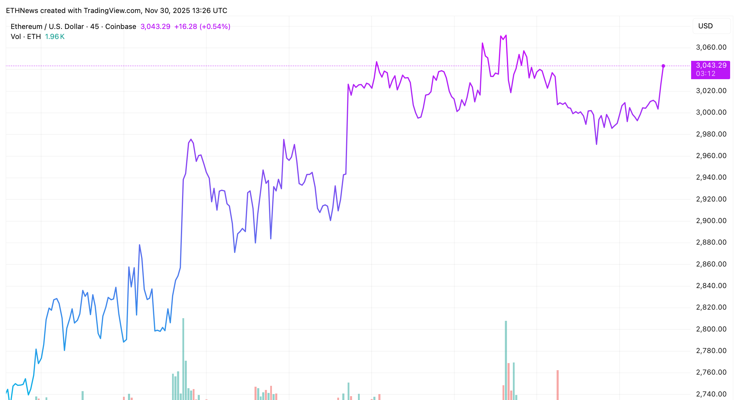 最新の45分チャートは、ETHが$3,043近くで取引されており、数日間の圧縮ボラティリティの後に安定したモメンタムを得ていることを示しています。