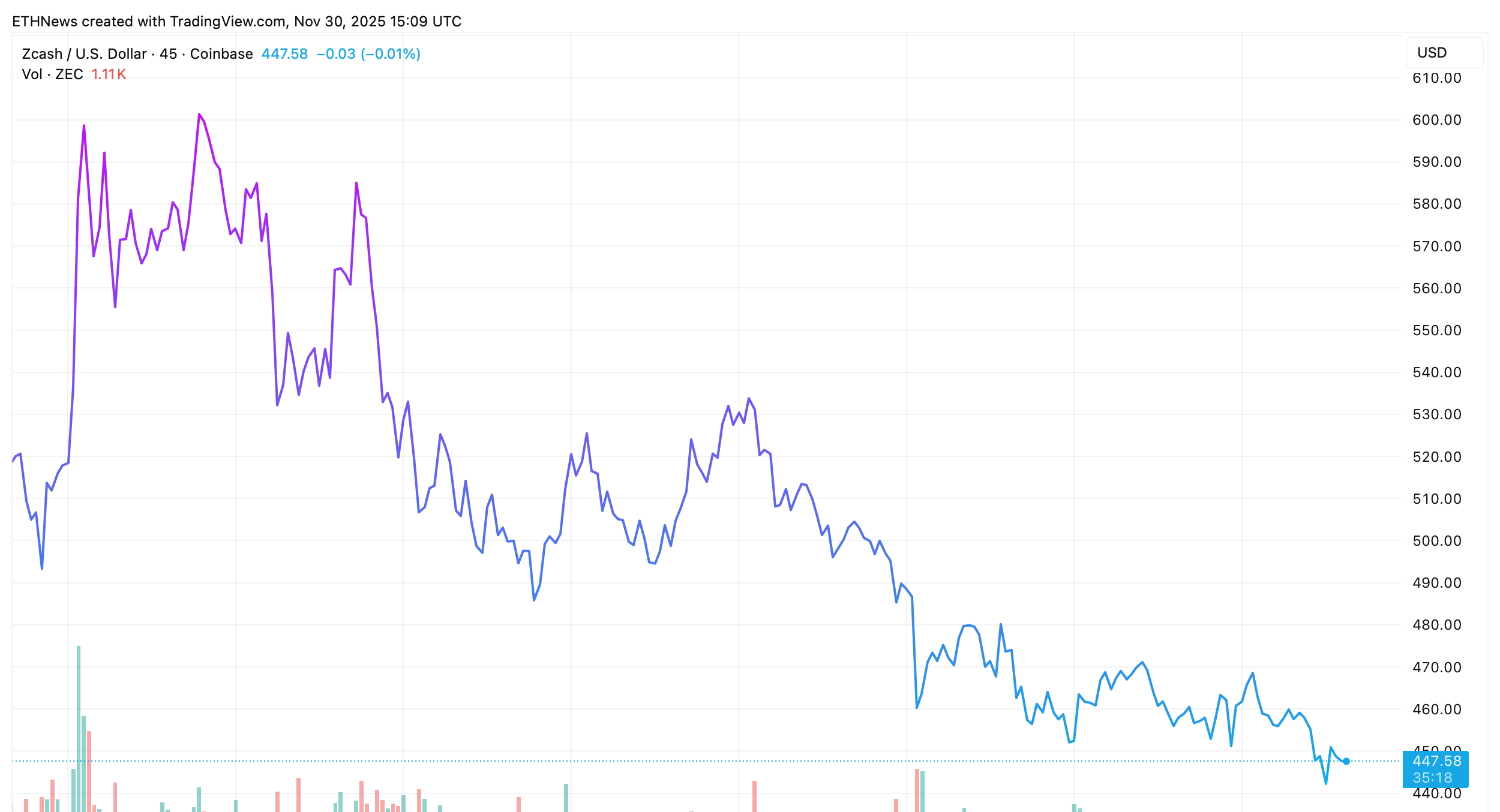 Zcashは下落傾向にあり、最新のTradingViewチャートでは$520 以上から約$447までの持続的な減少が示されており、市場の感情が冷却していることを反映しています。取引量は控えめであり、プロジェクトの長期的な方向性に対する不確実性が高まる中で、強い買い手の確信が不足していることを示唆しています。