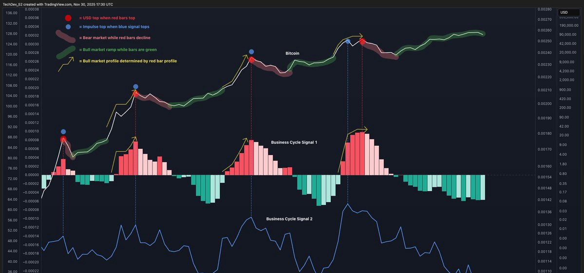 ソース: ETHNews原題: これが16年間にわたってすべてのビットコインサイクルをマッピングした2つの信号ですオリジナルリンク: https://www.ethnews.com/here-are-the-two-signals-that-have-mapped-every-bitcoin-cycle-for-16-years/著名なマーケットアナリストTechDevによる新しい分析が、暗号コミュニティの間で急速に広がっています。彼の最新のチャートは、彼の研究によれば、過去16年間のすべての主要なビットコインのフェーズを示している2つの長期的な市場信号を強調しています。興奮したサイクルのピークから厳しいベアマーケットの底まで。ビットコインが不安定なマクロ環境を航行する中、TechDevのフレームワークは、利用可能な最も明確な長期的ロードマップの一つと見なされています。## ビットコインのマクロストーリーを導く二つのシグナルTechDevの研究は、2つのビジネスサイクルスタイルのオシレーターに焦点を当てています。彼は、それらが一緒にビットコインの市場行動の全体的なリズムを捉えていると主張しています。すべてのサイクルにわたり、シグナルはブルマーケットが形成され始める時期、主要なサイクルトップが発生する時期、米ドルがピークに達する時期、ベアマーケットが展開する様子、深いボトムが形成される時期、そしてビットコインが緩やかな"グラインドアップ"回復フェーズに入る前の段階を特定しています。ビットコインがニッチな実験からグローバルな資産へと進化したにもかかわらず、これらのシグナルによって明らかにされた長期的な構造は驚くほど一貫している。## チャートの内部:すべてのサイクルにわたる一貫したリズムTechDevが共有したチャートは、これらのオシレーターをビットコインの全マクロ履歴の上に重ねています。最初の指標は、強力なブルマーケットの終わり近くでピークに達し、その後ベアマーケットが始まると急激に下降する傾向があります。2番目の指標はよりゆっくりと動き、数年の低迷中に底を打ち、長期的な蓄積が行われていることを示します。2つの指標が特定のゾーンに同時に到達すると、ビットコインは歴史的に大きな転換点に入ってきました。これは、ブルサイクルの爆発的な最終段階か、ベアマーケットの疲弊点のいずれかです。このパターンが2013年、2017年、2021年に繰り返されることで、長期サイクルアナリストの間でモデルに信頼性が与えられます。## ビットコインが現在どこにあるか両方のシグナルの現在の位置に基づくと、ビットコインは長期オシレーターの下部領域から浮上しているようです。過去のサイクルでは、このゾーンは回復の初期段階を示しており、市場がより攻撃的な拡張に入る前に徐々に力を取り戻す期間です。このフェーズは通常、静かな価格動向、徐々に戻る需要、そして市場が以前の下落を消化することが特徴です。歴史的に見ても、これは次の主要な上昇ラリーに繋がる期間でもありました。## 次に来るもののための長期的な枠組みTechDevは、短期的なボラティリティやマクロ環境の変化にもかかわらず、これらの2つのシグナルが信頼できる指標であり続けていることを強調しています。ビットコインの市場規模、流動性、投資家基盤が変化しても、基盤となる構造は維持されました。もしこのパターンが10年以上続いているように続くなら、ビットコインは今、大きな動きの前にある中間サイクル回復段階を進んでいる可能性があります。歴史が繰り返されるかどうかは決して保証されていませんが、TechDevのモデルは、ビットコインが蓄積から加速へ、そして最終的には次の放物線的フェーズへと移行する過程を理解するための最も明確な長期的フレームワークの1つを提供します。
