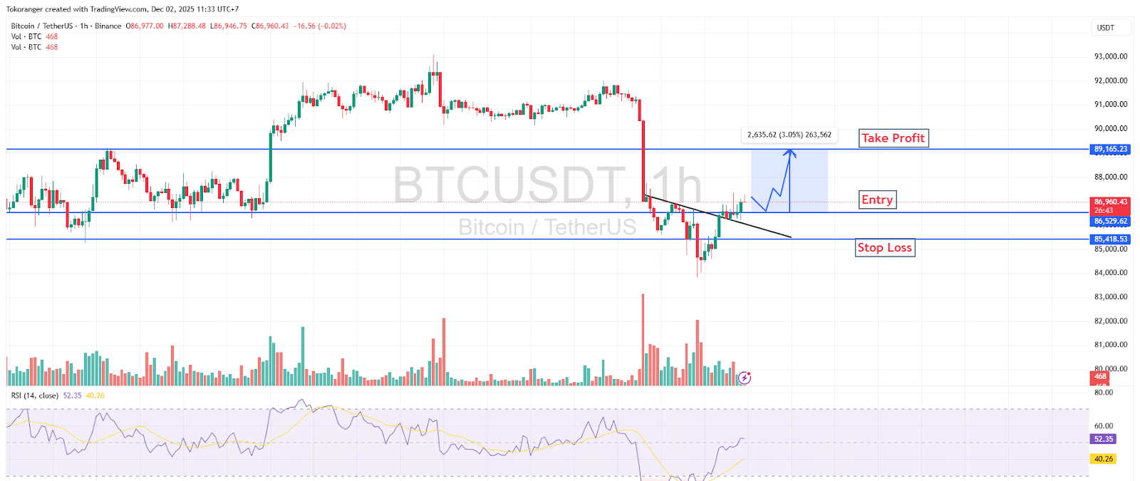 BTCは短期ダウントレンドラインを上抜けし、下落圧力から脱して新たな上昇の動きが始まっています。$86,529は強気キャンドル後に買い手が優勢となる理想的なエントリーポイントです。RSIも売られ過ぎゾーンから反発しており、買い圧力の回復を示しています。
