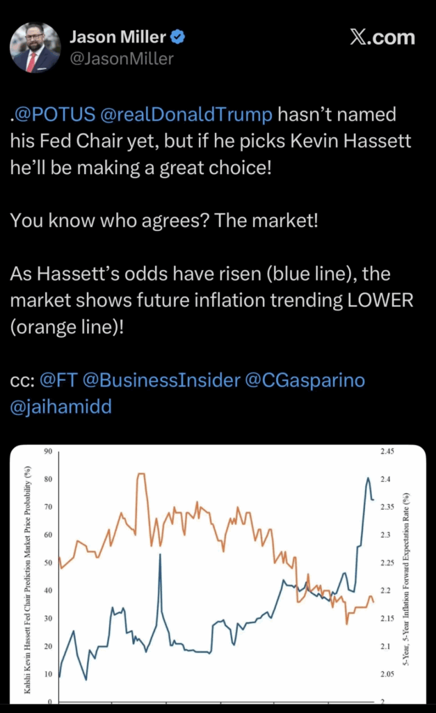 予測市場は、ケビン・ハセットが次期連邦準備制度理事会(FRB)議長になる可能性を徐々に評価し始めており、彼の指名の可能性をインフレ率低下の予測と関連付けている