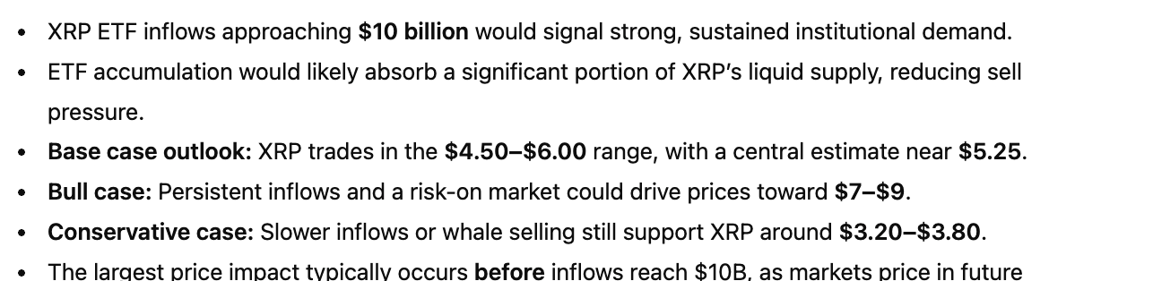 これらの要因に基づき、最終的な予測では、ETF流入が$10 十億ドルに達した場合、XRPは約$5.25に達すると見込まれています。通常の市場条件下では、ボラティリティにより価格は$4.50から$6.50の範囲内に収まる可能性が高いです。