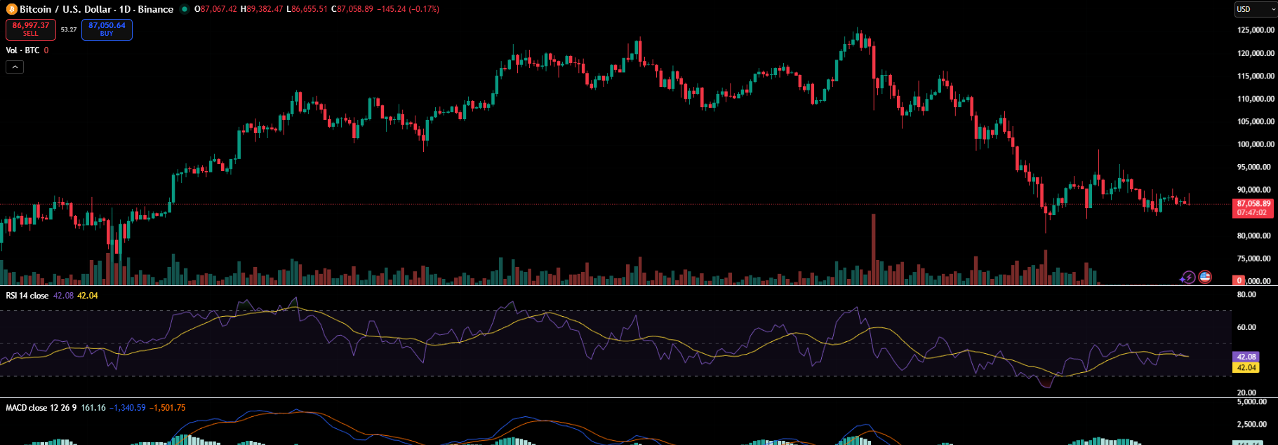 勢いの指標もこの曖昧さを反映しています。日足のRSIは数ヶ月の弱さの後に安定し始めており、アナリストたちは価格の下で早期のダイバージェンスシグナルが形成されつつあることに注目し始めています。