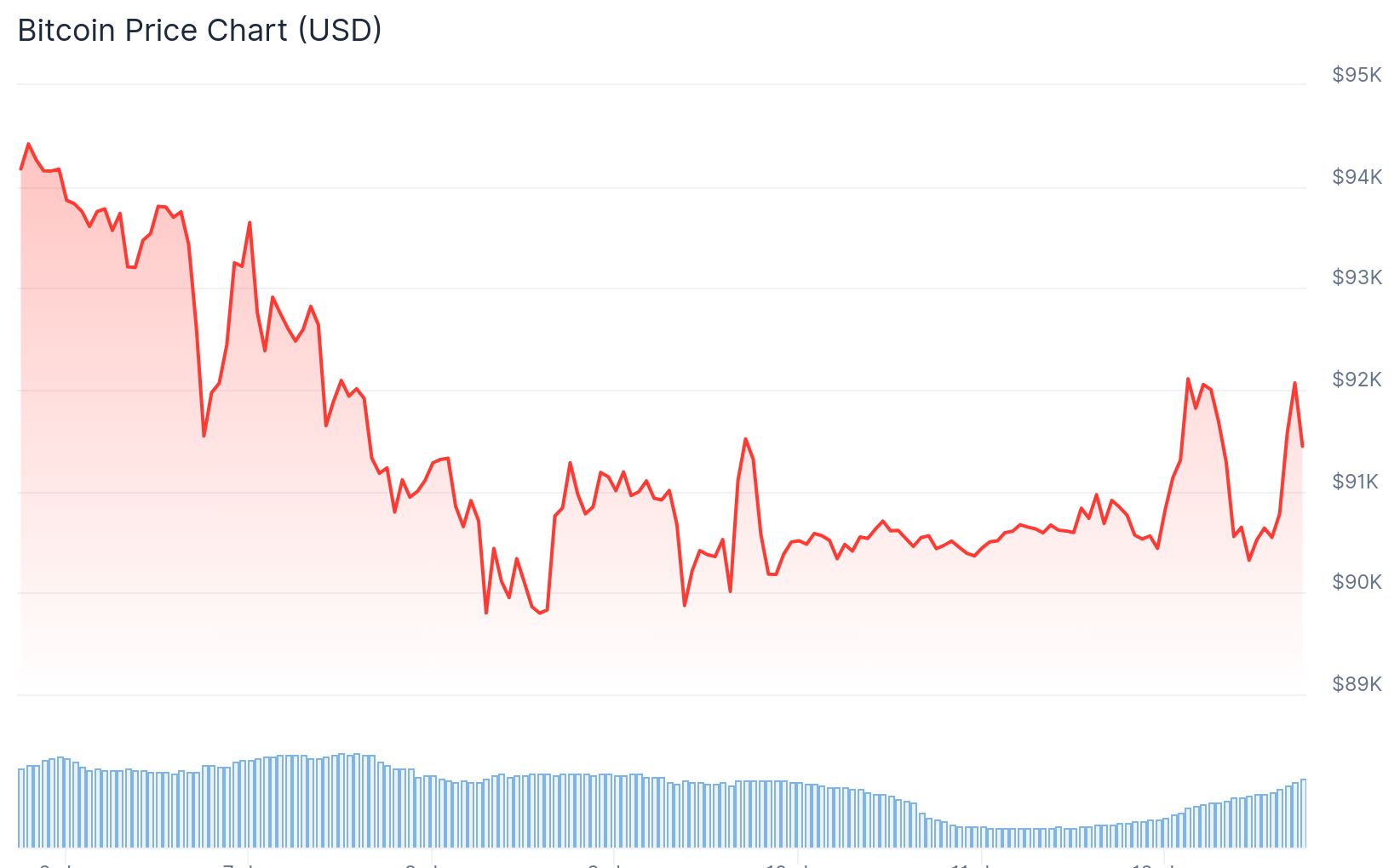 取材時点で、ビットコイン (BTC) は約91,400ドル付近で推移し、今日0.5%上昇、週次では約2.5%下落しています。暗号市場全体の時価総額は約3.2兆ドルで、こちらも日中わずかに上昇しました。