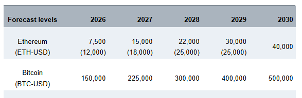 イーサリアム (ETH) は0.5%下落し、約3,100ドルとなり、週次損失は2.5%となっています。価格の停滞にもかかわらず、スタンダードチャータードのアナリストは月曜日の朝のリサーチノートで、長期的なETHの予測を引き上げ、2030年末までに4万ドルに達する可能性があると予測しました。一方、アナリストは同じ期間にビットコインが50万ドルに達すると予測しています。