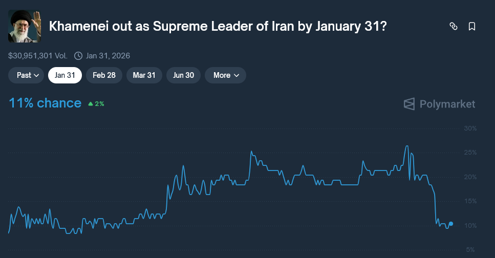 しかし、3つ目のウォレットは再び現れ、2日前にイランの最高指導者が1月31日までに権力を失うと予測する新たな賭けを行った。この市場は、イラン全土で抗議活動が続く中、依然として開かれている。