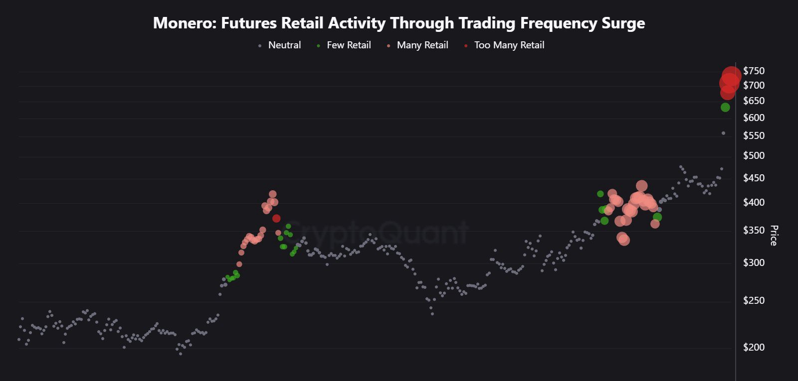 今、同じシグナルがMoneroにも点滅しています。XMRがその放物線的な上昇に深く入り込んだ$714 付近で、リテール頻度の閾値が現れました。これは重要です。なぜなら、これらの設定はしばしば感情的な参加を反映し、買い手が遅れて入り、流動性が薄くなり、ボラティリティが急激に増加するからです。