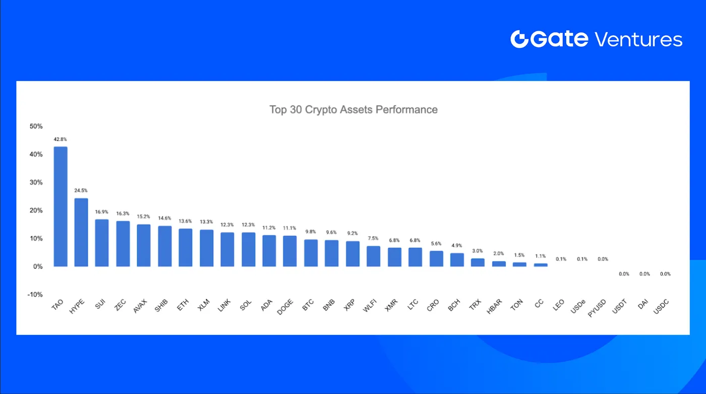 上位30のデジタル資産の平均価格は8.8%上昇し、TAO、HYPE、SUIがリード。TAOはAIエージェントの熱狂により42.6%急騰、HYPEは買い戻しにより24.5%上昇。
