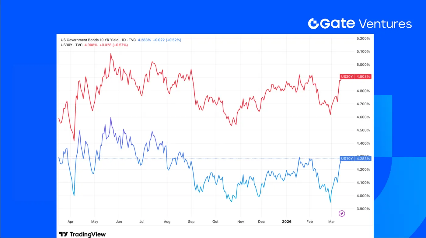 # 要約* 米国のインフレは安定を保ち、2月のCPIは前年比2.4%上昇。原油価格を中心としたインフレリスクの高まりにより、市場のFRB利下げ期待は次第に後退。* 米国第4四半期のGDPは0.7%に下方修正され、経済の勢いが鈍化。エネルギーコストの上昇が消費需要をさらに抑制する可能性。* 来週発表予定の重要データには、2月の小売売上高と鉱工業生産が含まれる。* 先週の暗号資産市場は堅調に反発し、ETHはBTCよりも好調。BTCは10.4%上昇、ETHは12.4%上昇。現物ETFの資金流入も堅調で、BTC ETFは76.73億ドルの純流入、ETH ETFは16.08億ドルの純流入。* 上位30のデジタル資産の平均価格は8.8%上昇し、TAO、HYPE、SUIがリード。TAOはAIエージェントの熱狂により42.6%急騰、HYPEは買い戻しにより24.5%上昇。* また、HSBCとスタンダードチャータード銀行が香港で最初のステーブルコインライセンス取得候補と報じられる。* 資金調達では、MetaCompが3,500万ドルのPre-Aラウンド資金調達を完了し、規制準拠のWeb2.5決済インフラの拡大に充てる。# マクロ経済概況2026年2月のCPIはエネルギーコスト上昇の背景で安定2月のCPIは前年比2.4%増で、市場予想通り。だが、エネルギーを中心としたインフレリスクは高まっている。米イラン紛争の影響でガソリン価格は1ガロン3.50ドルに急騰し、2024年以来の高値を記録。月間で21%の上昇となった。この動きは今後数ヶ月で全体のインフレを押し上げ、FRBの金融政策見通しを複雑にする見込み。インフレリスクの高まりにより、市場のFRB利下げ期待は大きく後退し、金融政策は慎重さを増す。高まるエネルギーコストは、消費者の購買力を圧迫し、企業の生産コストを押し上げ、経済成長を鈍化させる可能性もある。地政学的な不確実性の中、FRBはインフレ抑制と雇用維持の間で難しい舵取りを迫られる。米国第4四半期GDPは0.7%に下方修正され、2026年初の経済勢いの減速を示す。油価の高騰は消費者の自由支出を抑制し、GDP成長のリスクを高めている。大規模な税制改革の刺激効果はあるものの、エネルギー支出の増加がこれを相殺し、可処分所得と企業収益を圧迫している。ホルムズ海峡の輸送量が75%急減し、尿素価格は1週間で19%上昇し、1トンあたり590ドルに達した。化学肥料のコストは急騰し、世界の海運化学肥料取引の3分の1がリスクにさらされている。燃料費と運賃の上昇により、世界的な食品インフレの下落トレンドは逆転。供給側のショックは世界の食料安全保障を脅かし、各国中央銀行の地域経済安定策を複雑にしている。エネルギー危機はインフレ圧力を長引かせ、経済拡大を遅らせる可能性が高い。投資家は慎重になり、配当株や防御的セクターを好む傾向。来週は2月の小売売上高と鉱工業生産の発表が予定されており、エネルギーコスト高の中での消費者需要の堅調さや製造業の健全性を評価する上で重要となる。市場は小売売上高の緩やかな増加を予測するが、高油価は自由支出を制約する可能性も。鉱工業生産は中東の紛争による供給網の混乱の影響を受ける可能性がある。これらのデータは、経済の勢いとFRBの金融政策見通しの判断に影響し、リスク資産や債券利回りに波及する。(1)DXY今週のDXY指数は中東の緊張と米国の堅調なインフレデータを背景に上昇し、リスク回避の動きが強まり、約0.5%上昇。これにより、市場のFRBハト派からタカ派への見方が強まった。変動が激化し、日本や韓国は為替変動に対応する措置を取った。(2)米国10年・30年国債利回り米国10年債利回りは3.8%近辺に上昇し、30年債は4.1%を突破。インフレと地政学リスクへの懸念を反映。利回り曲線はやや急峻化し、インフレ持続とFRBの利下げ遅延を織り込む動きが見られる。(3)金価格今週の金価格は約1.2%上昇。地政学的リスクとインフレ懸念を背景に、投資家は中東の紛争や株式市場の変動の中で安全資産を求めている。(4)---# 暗号資産市場概況# 主要資産[BTC价格](/price/bitcoin-btc)[ETH价格](/price/ethereum-eth)ETH/BTC比率先週、BTCは10.4%上昇し、ETHの方が好調で、12.4%の上昇。資金流入では、BTC現物ETFは76.73億ドルの純流入、ETH現物ETFは16.08億ドルの純流入を記録。(5)ETH/BTC比率も1.87%上昇し、0.03に達し、ETHの相対的な強さを示す。市場のセンチメントはやや回復し、恐怖と貪欲指数は先週の8から今週の23へ上昇したが、依然として極度の恐怖域に留まる。(6)# 時価総額暗号資産の総時価総額BTCとETHを除く暗号資産の時価総額上位10通貨を除く暗号資産の時価総額先週、[加密市场](/price)の時価総額は9%上昇。BTCとETHを除くと5.3%の上昇、さらに上位10通貨を除くと、アルトコイン市場は7%の上昇を見せた。# 上位30暗号資産のパフォーマンス出典:CoinmarketcapとGate Ventures、2026年3月16日時点上位30資産の平均上昇率は約8.8%。TAO、HYPE、SUIがリード。TAOは42.6%の急騰を記録し、AI関連トークンの反発とOpenClawやPerplexity Computerなどのスマートエージェントの熱狂に牽引された。HYPEは先週24.5%上昇し、HyperCoreの買い戻し速度がステーキングの解放を上回り、トークンの純的なデ