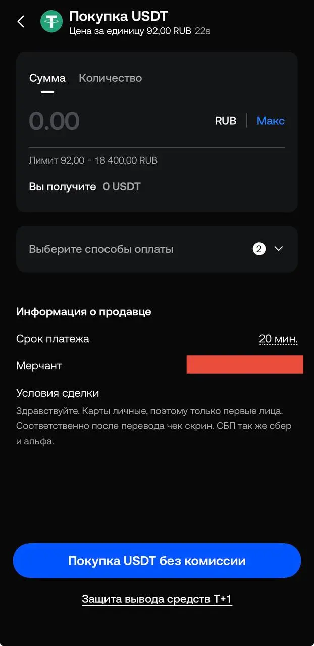 ステップ3:販売者を選択したら、暗号資産または法定通貨の金額を入力し、その後下部の「手数料なしで購入」をクリックします。確認ウィンドウが表示されますので、情報を注意深く確認し、さらに「注文を継続」をクリックして確認します。