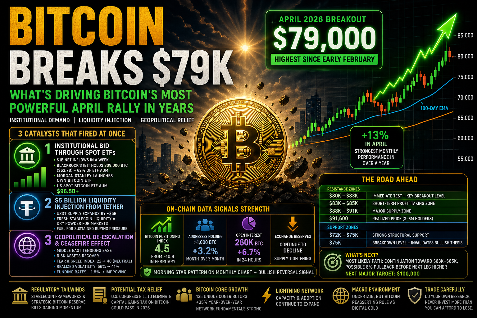 ## [#ビットコインが79Kを突破]() — 何が数年ぶりの最も強力な4月のラリーを駆動しているのかビットコインはまたやってのけた。数ヶ月にわたる圧力の蓄積、横ばいの動き、そして振るい落とすのが不可能に思えた弱気のセンチメントの後、世界をリードする暗号通貨は\$79,000の壁を突破し、過去一年以上で最も強力な月間パフォーマンスを記録し、完全なブルマーケットの再開が始まったのかという議論を再燃させている。これは誇大広告や小売の熱狂から生まれた動きではない。実際の構造的変化に基づく多層的なラリーであり、その変化を理解することが次に何が起こるかを理解する鍵となる。---### \$79Kへの道:どうやってここにたどり着いたのかこのブレイクアウトの重要性を理解するには、背景が重要だ。ビットコインは2025年10月のピーク\$126,000付近から長期にわたる弱気チャネルに閉じ込められていた。数ヶ月にわたり、どんなリバウンドも同じ下降トレンドラインによって抑えられていた。センチメントは暗いものだった。暗号恐怖と貪欲指数は極端な恐怖レベルに崩れ落ち、100点満点中22点にまで低下していた。実現ボラティリティは56%と高止まりしていた。永久先物市場の資金調達率は深くマイナスに反転していた。そして、2026年4月中旬の約2週間の間に、すべてが一変した。ビットコインはその下降トレンドラインを決定的に突破し、100日指数移動平均線を取り戻し、約13取引セッションで\$7,000近く上昇し、\$79,000のレベルをテストし突破した — これは2023年2月初旬以来見られなかった価格水準だ。この動きは1ヶ月で13%の純粋な上昇を示し、数ヶ月にわたる分配フェーズから資産を解放した。---### 一度に3つの触媒が発動このラリーが過去の偽りの始まりと異なるのは、それが単一のストーリーによるものではなかったことだ。3つの異なる強力な力が同じ2週間のウィンドウ内に収束し、複合効果を生み出し、売り手を圧倒し、2022年のFTX崩壊以来最大級のショートスクイーズの一つを引き起こした。**1. スポットETFを通じた機関投資家の買い**この動きの最も強力なエンジンは、米国上場のスポットビットコインETFを通じた絶え間ない機関投資家の積み増しだ。4ヶ月にわたる資金流出の苦しい期間の後、これらの商品は劇的な反転を見せた。週次純流入額はほぼ$1 十億ドルに達し、2026年1月中旬以来最大の単週記録となった。4月下旬の1取引日だけで$335 百万ドルが流入し、そのうちブラックロックのIBITだけでほぼ$247 百万ドルを占めていた。機関投資家のコミットメントの規模を理解するために:ブラックロックのIBITは現在、80万9000BTC以上を保有し、その価値は約637億ドルに上る。これは、米国の投資家向けに利用可能なすべてのスポットビットコインETF商品における資産運用総額の62%を占める。2026年第1四半期の取引日62日のうち48日で純流入を記録した。これは投機ではない。戦略的配分だ。2026年4月はまた、モルガン・スタンレーが独自のビットコインETFを立ち上げた画期的な瞬間でもあった。同社は世界最大級の資産運用会社の一つであり、IBITを通じてすでに12億ドル超のスポットビットコインエクスポージャーを蓄積していた。モルガン・スタンレーの参入は、ビットコインが閾値を超えたことを示す。もはや実験として評価されているのではなく、機関投資ポートフォリオにふさわしい高品質の流動資産として扱われている。米国のすべてのスポットビットコインETFの総運用資産は既に965億ドルを超えている。2026年4月18日までの週のグローバル暗号資金流入は14億ドルに達し、そのうちビットコイン商品が11億ドルを占めている。**2. テザーからの10億ドル規模の流動性注入**2つ目の触媒は、USDT供給の約$5 十億ドルの拡大だ。暗号市場において、テザーの供給増加は価格動向の最も信頼できる先行指標の一つだ。新たなステーブルコインの流動性は、資金の乾いた粉—ドル建ての資本—を意味し、リスク資産に投入されるのを待っている状態だ。この種の流動性が数ヶ月の停滞の後にエコシステムに流入すると、長くは待たずに動き出す。今回の注入は、ETFの資金流入による買い圧力を持続的な上昇に変える燃料となった。**3. 地政学的緊張緩和と停戦効果**3つ目の触媒はマクロ経済だ。特に中東情勢やホルムズ海峡を巡る地政学的緊張は、2026年初頭のリスク資産に重くのしかかっていた。ビットコインはヘッジとしての評判にもかかわらず、実際にはハイベータリスク資産として取引されており、不確実性のピーク時には\$60,000にまで下落していた。4月初旬の停戦は転換点となった。外交の兆しが改善し、和平交渉の見通しが出てくると、安全資産に逃れていた資金がリスク資産に回帰し始めた。ビットコインはその恩恵を最初に受けた。心理的な効果も非常に大きかった。Crypto恐怖と貪欲指数は22から—極端な恐怖の領域に深く入った状態から—48へと上昇し、中立的な水準に近づいた。実現ボラティリティは56%から