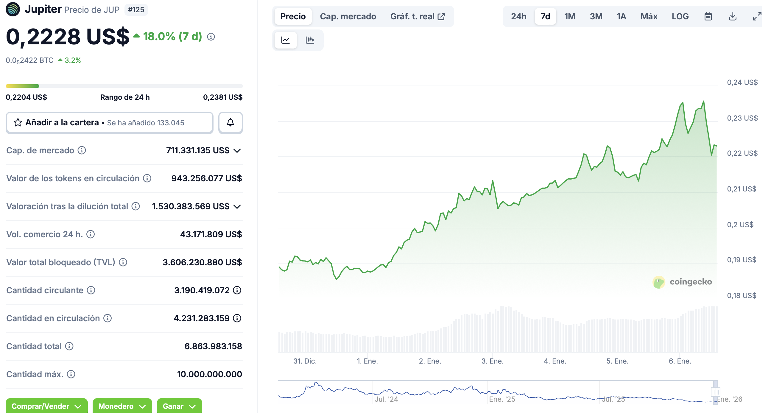 Jupiter’s native token, JUP, has risen about 18% over the past seven days.