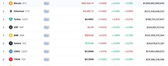 ビットコイン(BTC)は前日比0.23%上昇し、9万450.74ドルを記録して9万ドルのサポートラインを維持した。イーサリアム(ETH)は前日比0.48%上昇し、3085.72ドルで取引され、3000ドルのライン上に安定している。