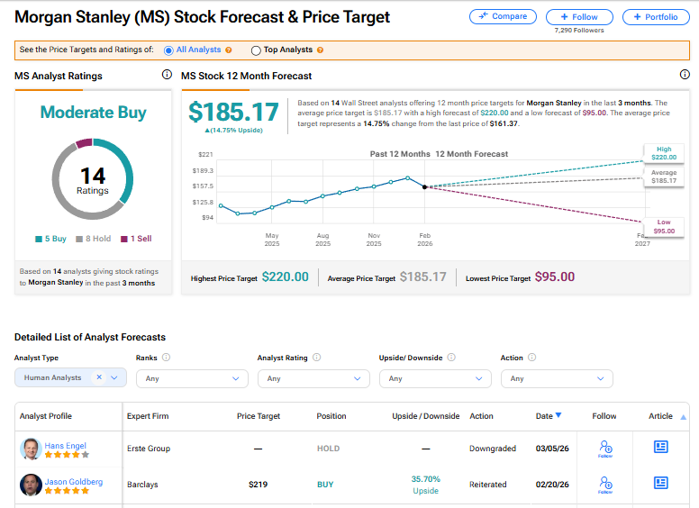 Morgan Stanley’s stock has a consensus Moderate Buy rating among 14 Wall Street analysts. That rating is based on five Buy, eight Hold, and one Sell recommendations issued in the last three months. The average MS price target of $185.17 implies 14.75% upside from current levels.