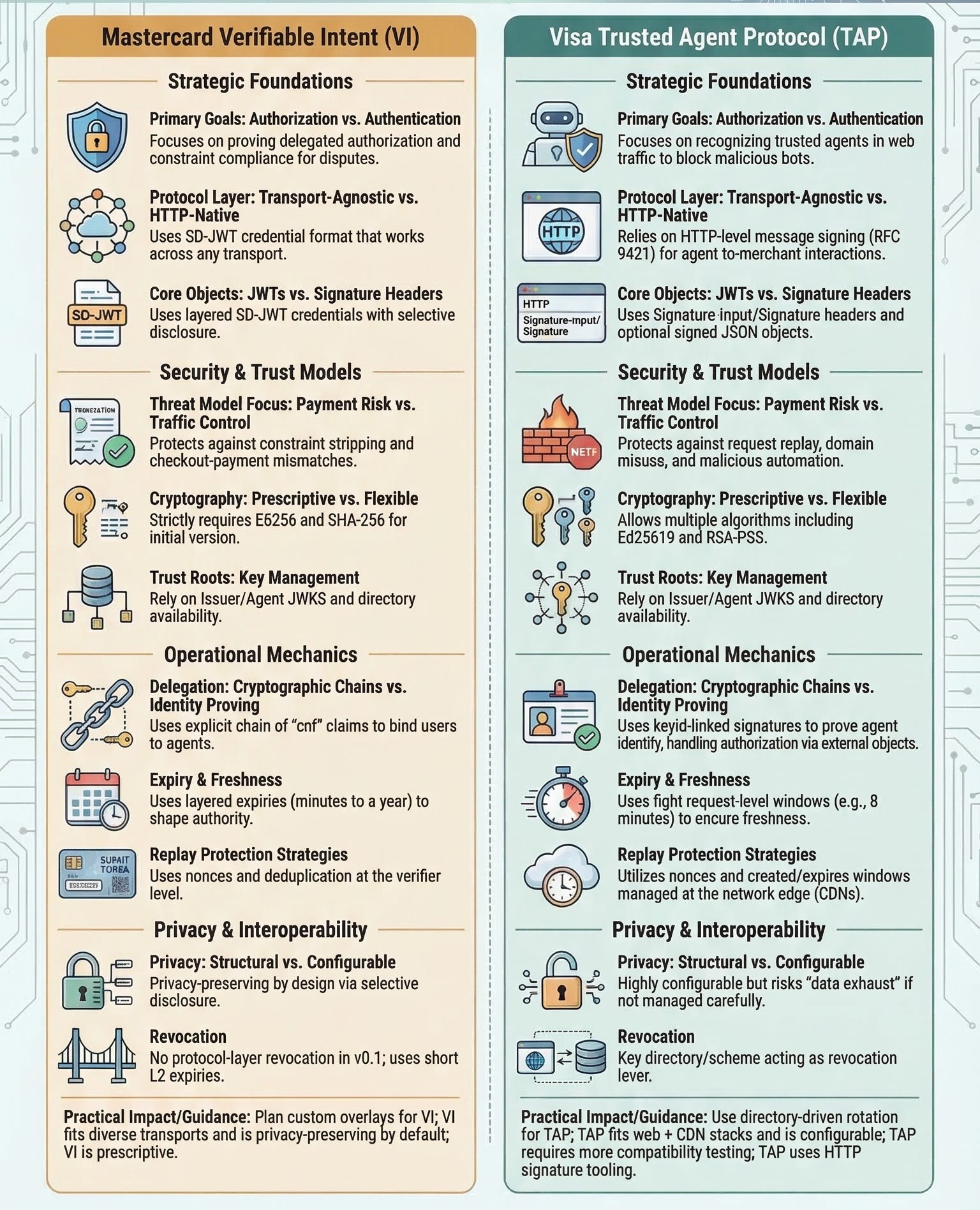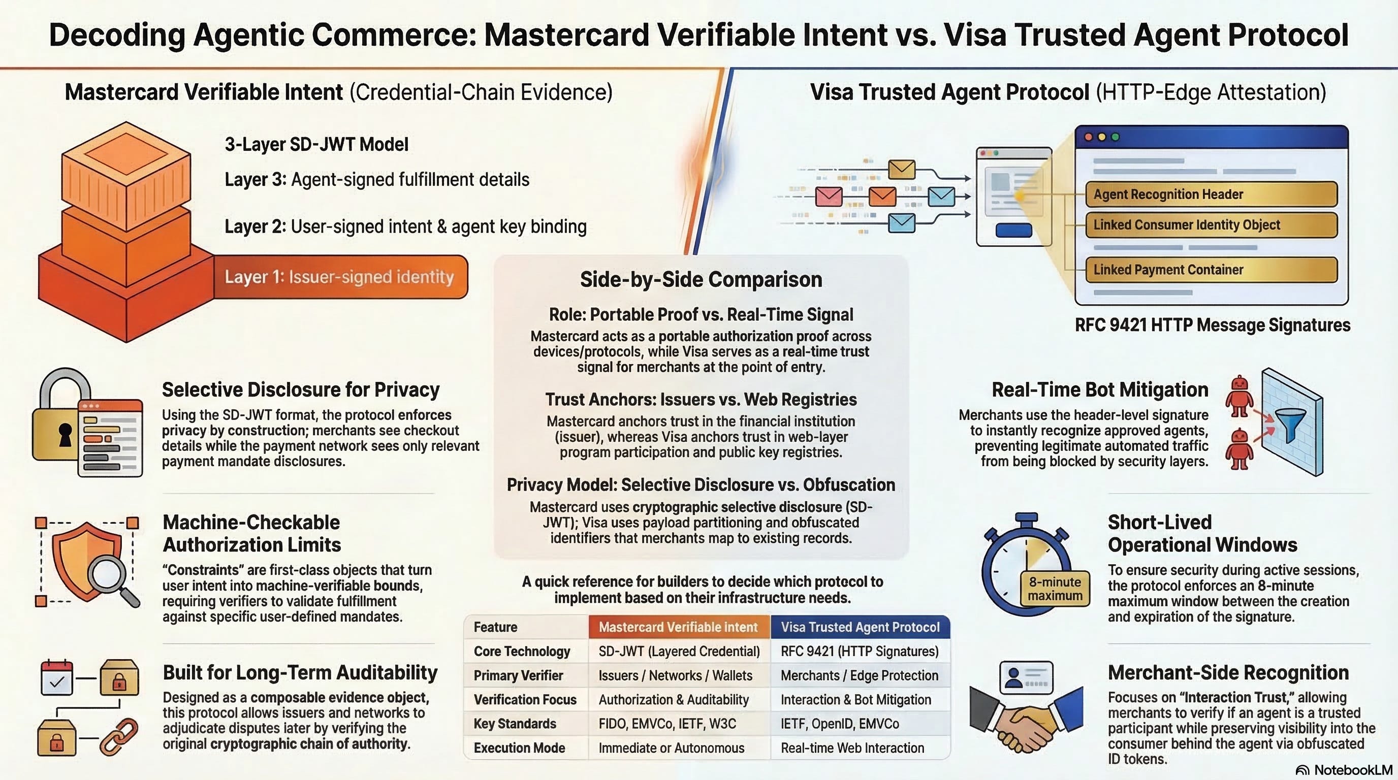 Both Mastercard Verifiable Intent and Visa Trusted Agent Protocol are “trust layers,” but they sit in different parts of the stack, and they optimize for different verifiers.