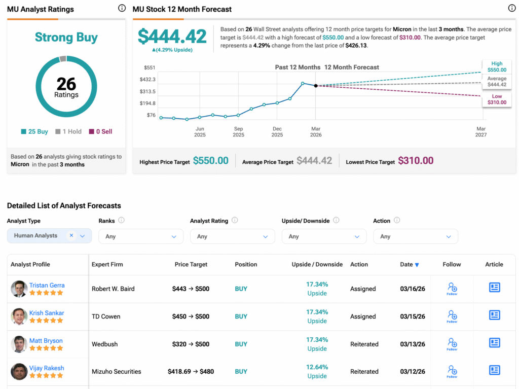 Micron stock has a consensus Strong Buy rating among 26 Wall Street analysts. That rating is based on 25 Buys and one Hold assigned in the last three months. The average MU price target of $444.42 implies 4.29% upside from current levels.