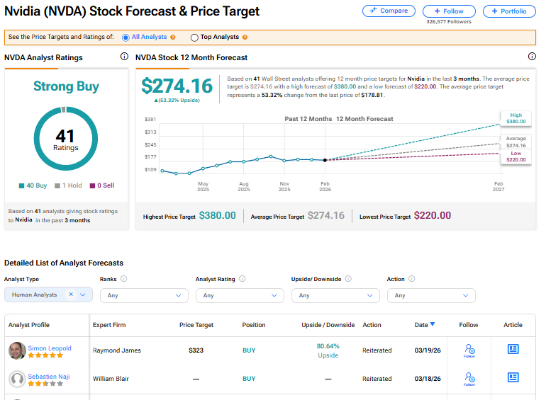 Nvidia’s stock has a consensus Strong Buy rating among 41 Wall Street analysts. That rating is based on 40 Buy and one Hold recommendations issued in the past three months. The average NVDA price target of $274.16 implies 53.32% upside from current levels.