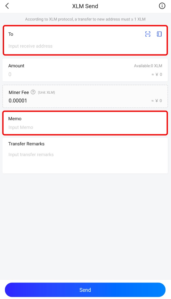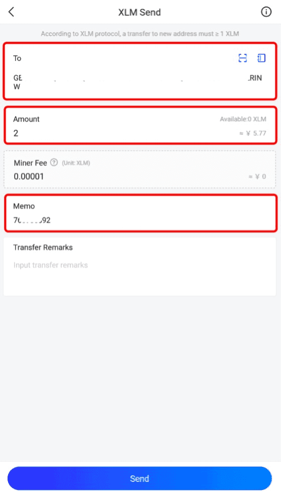 Passo 4: Preencha o endereço do destinatário, o valor do depósito e o memo exigido.