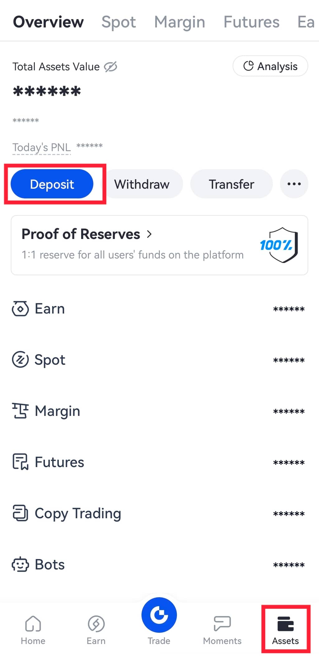 Passo 5: Abra o aplicativo móvel da Gate e faça login na sua conta. Vá para "Ativos" no canto inferior direito da página inicial e clique em "Depositar".