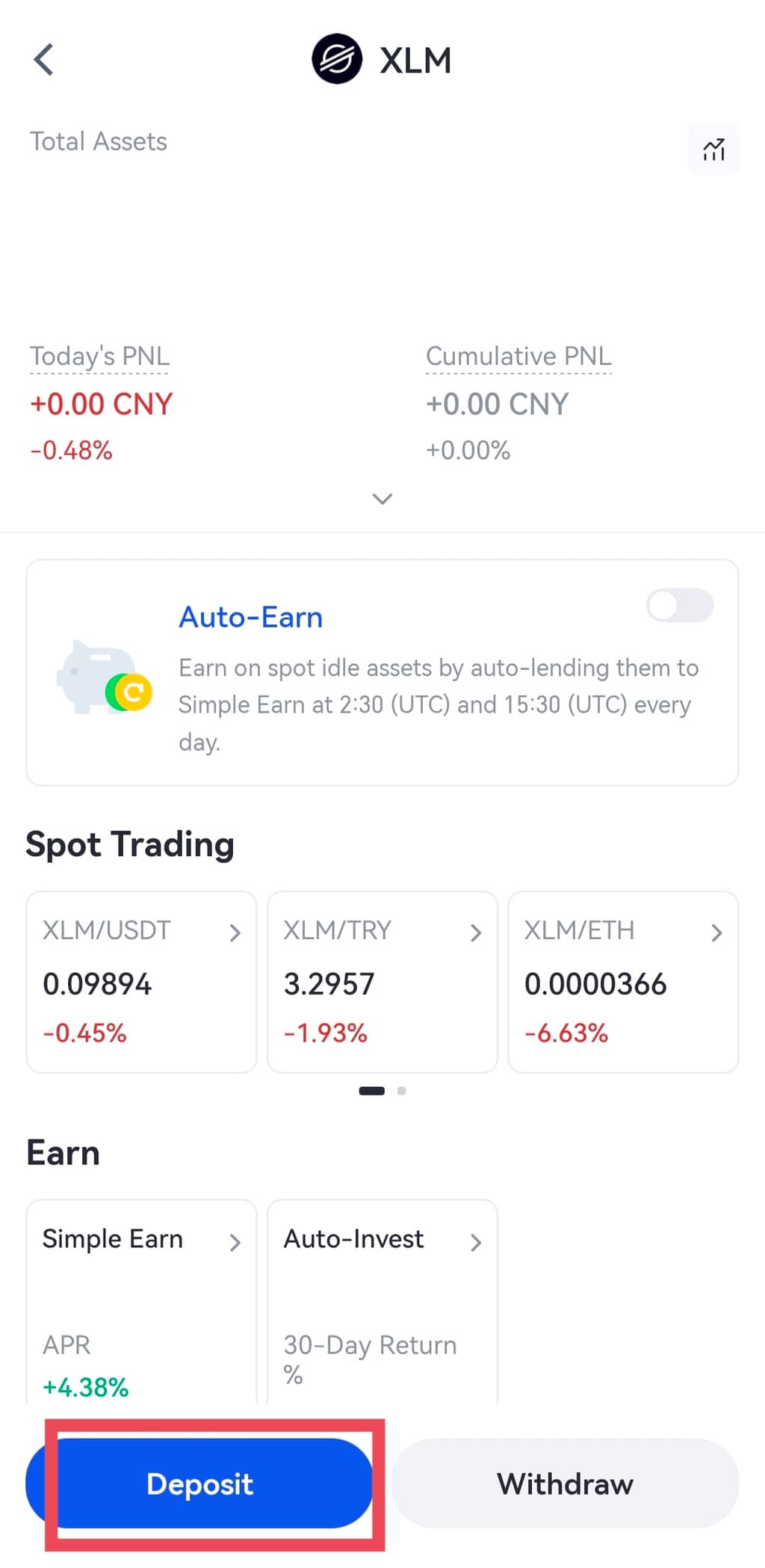 Alternativamente, você também pode ir para "Conta Spot". Digite e pesquise "XLM". Em seguida, clique em "Depositar".