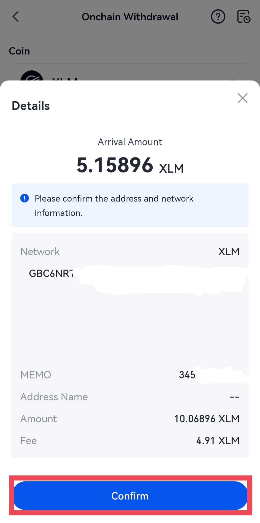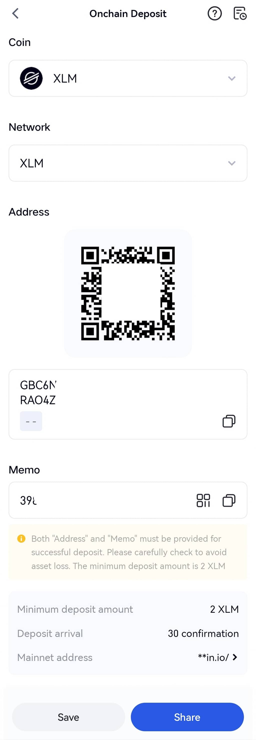 Passo 7: Você verá o endereço e o Memo na página de depósito de XLM.
