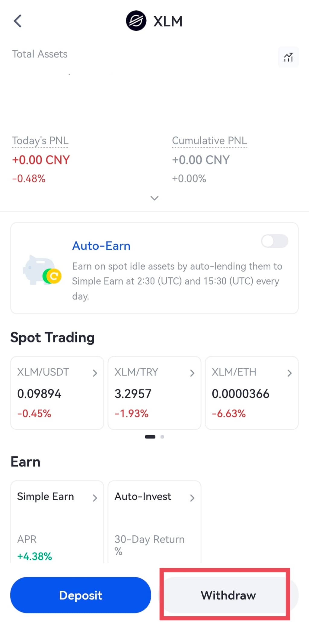 Alternativamente, você também pode ir para "Conta Spot". Digite e pesquise "XLM". Em seguida, clique em "Sacar".