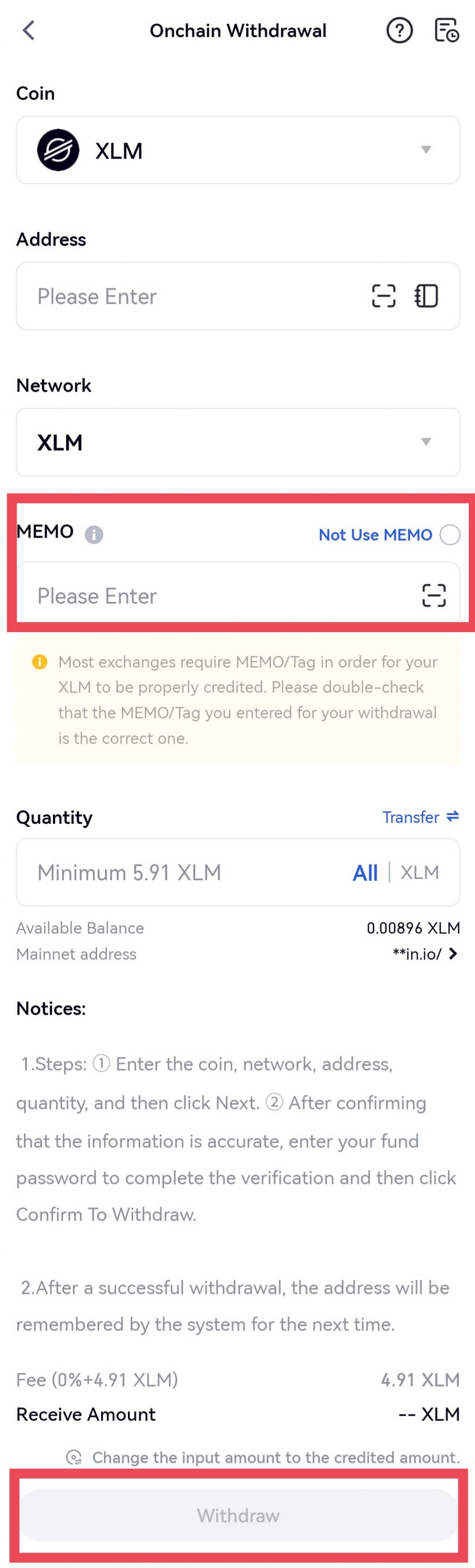 ① Ao fazer um depósito ou um saque, se você não vir uma caixa para um memo ou uma tag na página, não é necessário inserir MEMO/TAG.