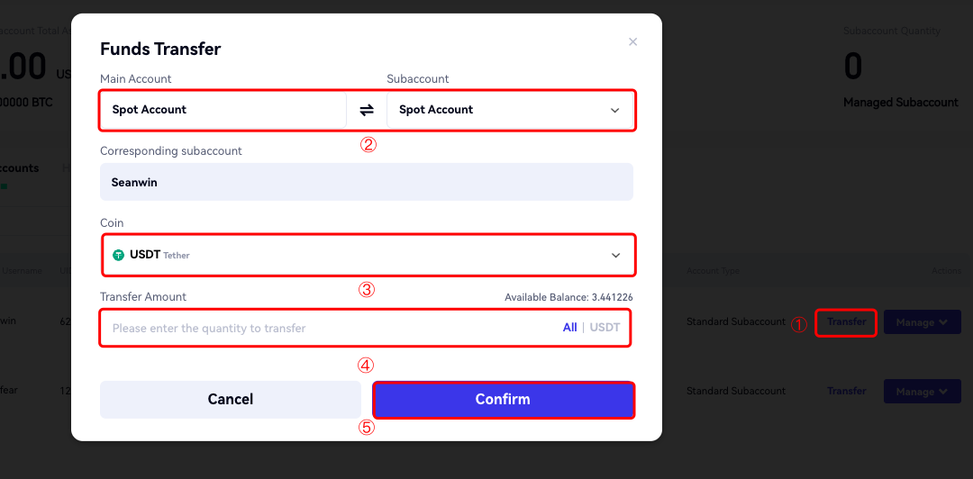 Etapa 5: Depois que a subconta for criada, volte para a página de [Gerenciamento de Subcontas] para transferir fundos para ela.