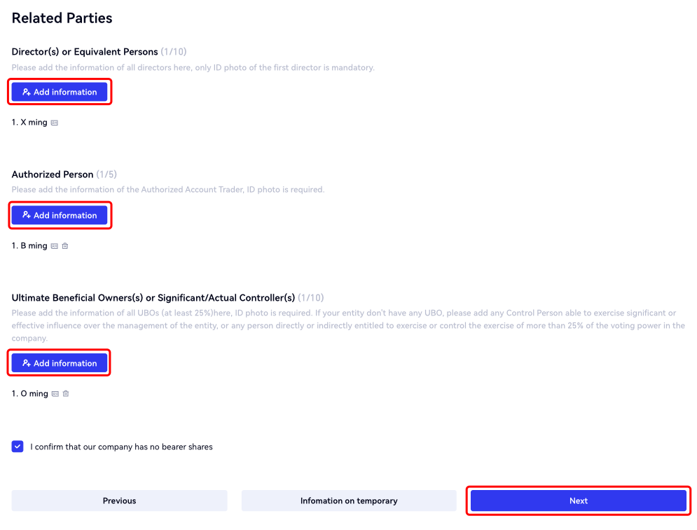 3.Na página "Partes Relacionadas", adicione informações (incluindo nomes e fotos dos documentos de identidade) para "Diretor(es) ou Pessoas Equivalentes", "Pessoa Autorizada" e "Beneficiário(s) Final(is) ou Controlador(es) Significativo(s)/Real(is)". Após completar o formulário, clique em "Próximo" ou "Informação temporária". Você também pode clicar em "Anterior" para modificar as informações já preenchidas.