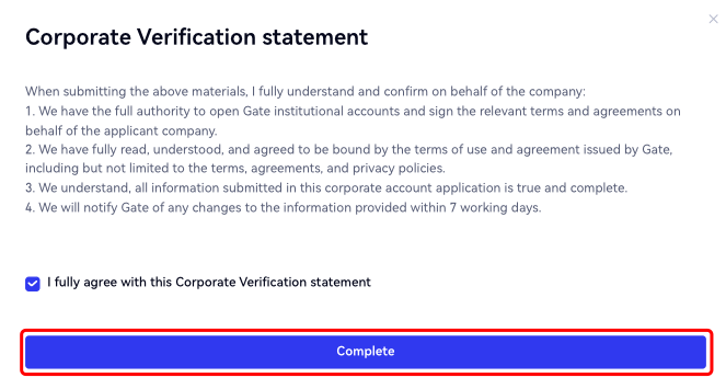 5.Leia atentamente a "Declaração de Verificação Corporativa", marque a caixa para confirmar a precisão das informações fornecidas e clique em "Concluir" para finalizar o processo de verificação. Sua solicitação será então analisada pela equipe da Gate.