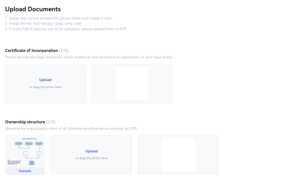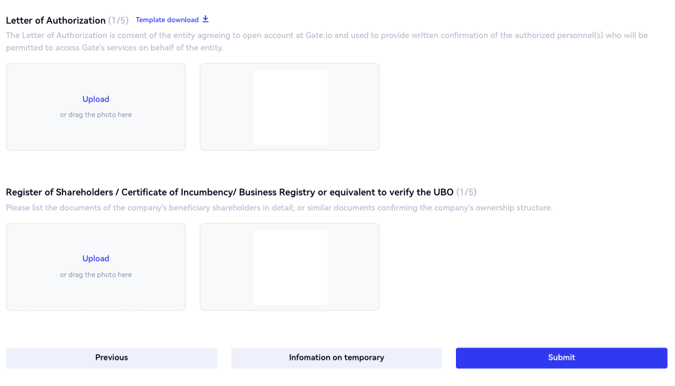 4.Na página "Fazer Upload de Documentos", carregue o certificado de constituição, estrutura de propriedade, carta de autorização e registro de acionistas/certificado de incumbência/registro comercial ou equivalente para verificar o UBO. Após enviar todos os documentos exigidos, clique em "Enviar" ou "Informação temporária". Você também pode clicar em "Anterior" para modificar as informações já preenchidas.